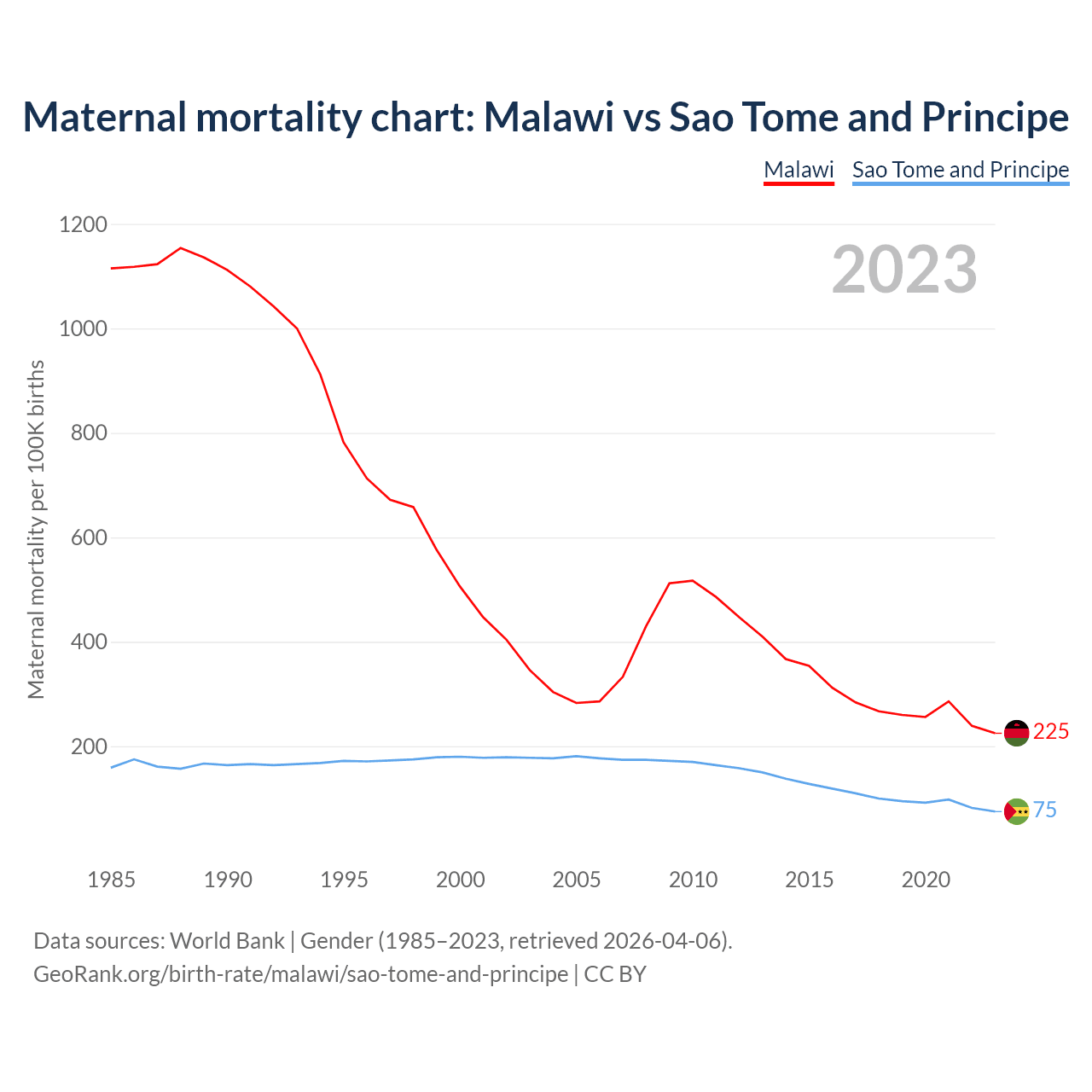 The maternal mortality rate, which is the probability of dying during childbirth or within 42 days of pregnancy termination, is 225 deaths per 100,000 live births in Malawi, compared to 75 deaths in Sao Tome and Principe.