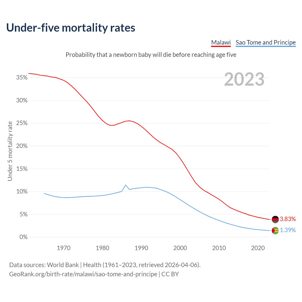 The chance that a newborn baby will die before reaching age five is 3.83% in Malawi and 1.39% in Sao Tome and Principe. Above is a chart with historical data on under-five mortality rates.