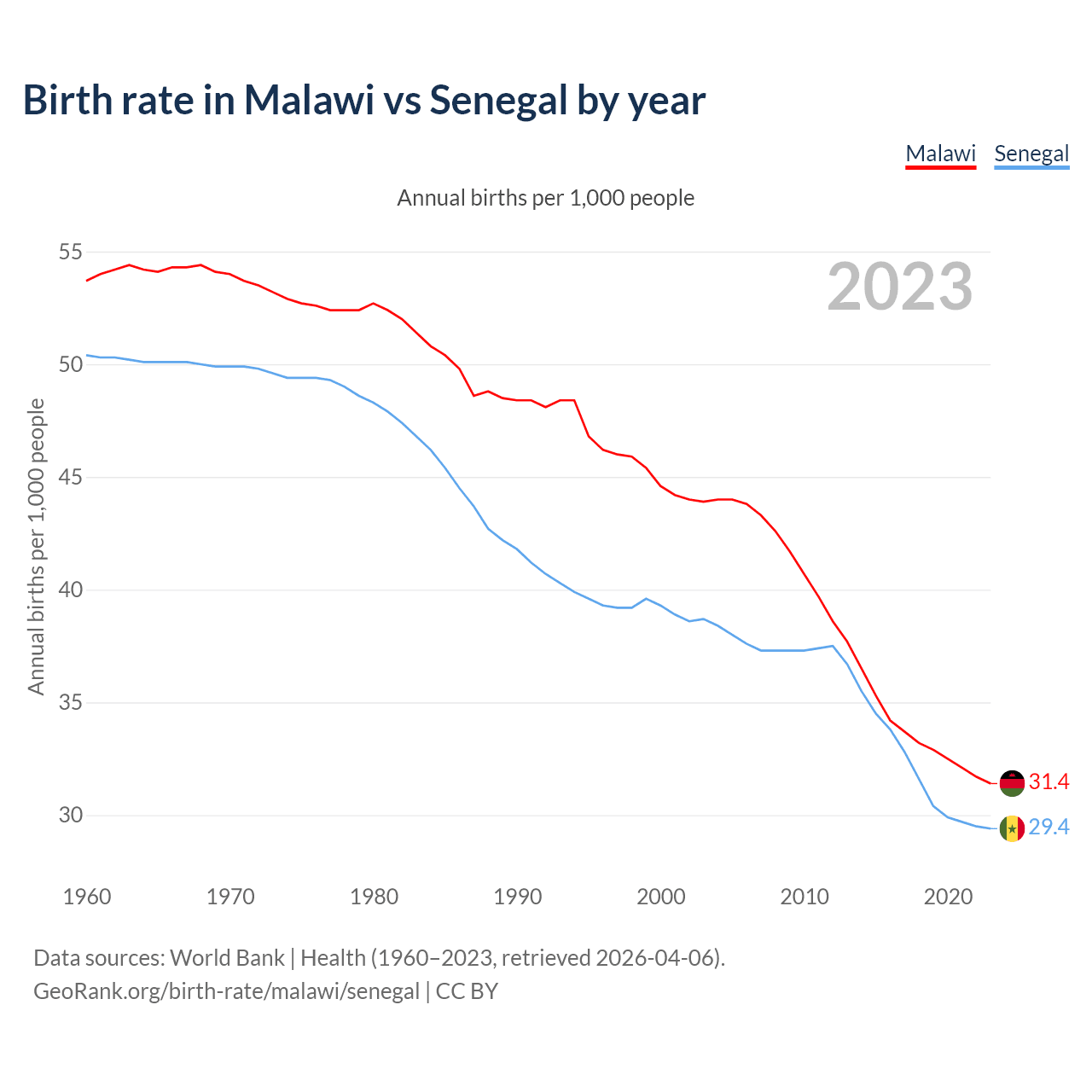 Malawi has an annual birth rate of 31.4 births per 1,000 people, compared to 29.4 for Senegal. The average number of children a woman is expected to have during her lifetime — the fertility rate, is 3.65 in Malawi and 3.82 in Senegal — 4.66% difference.
