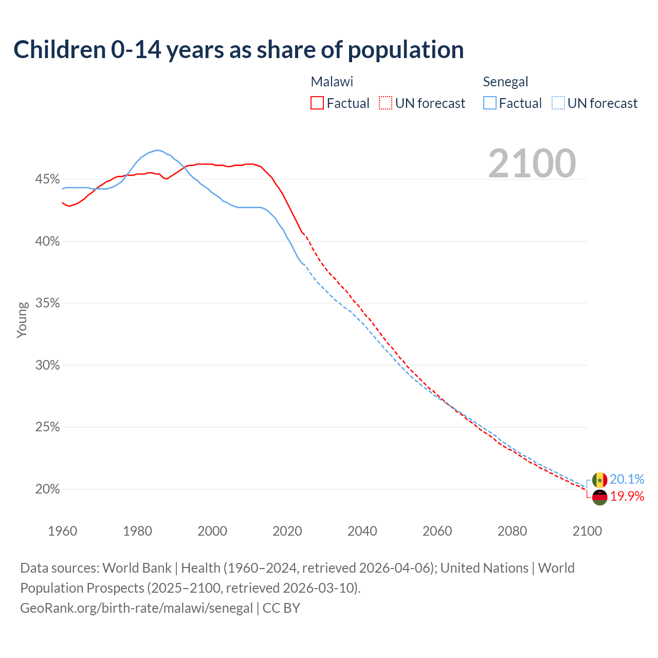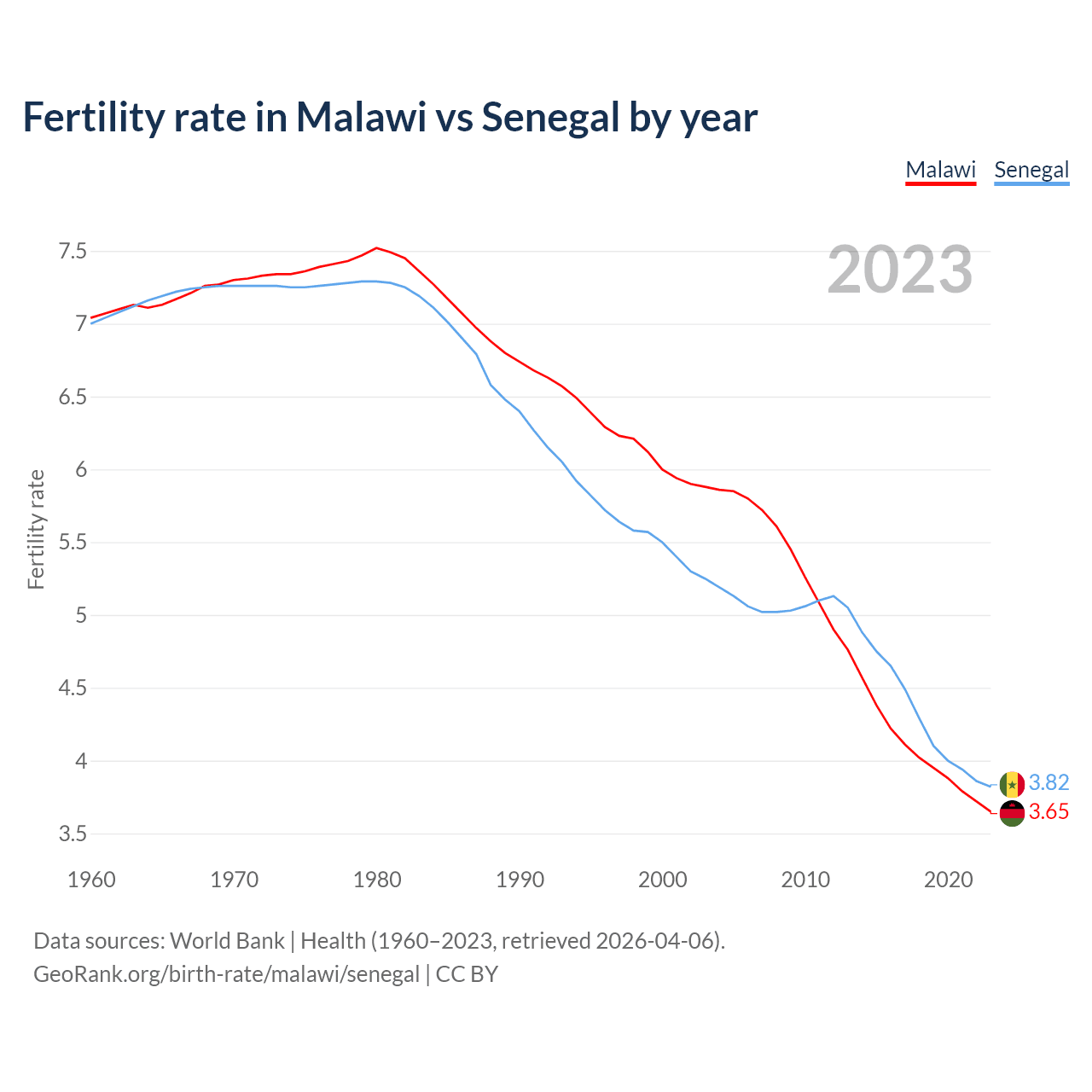 According to the latest available data on birth rates, the fertility rate in Malawi was 3.65 children per woman in 2023, compared to 3.82 in Senegal in 2023. The replacement level is considered to be 2.1 children per woman.