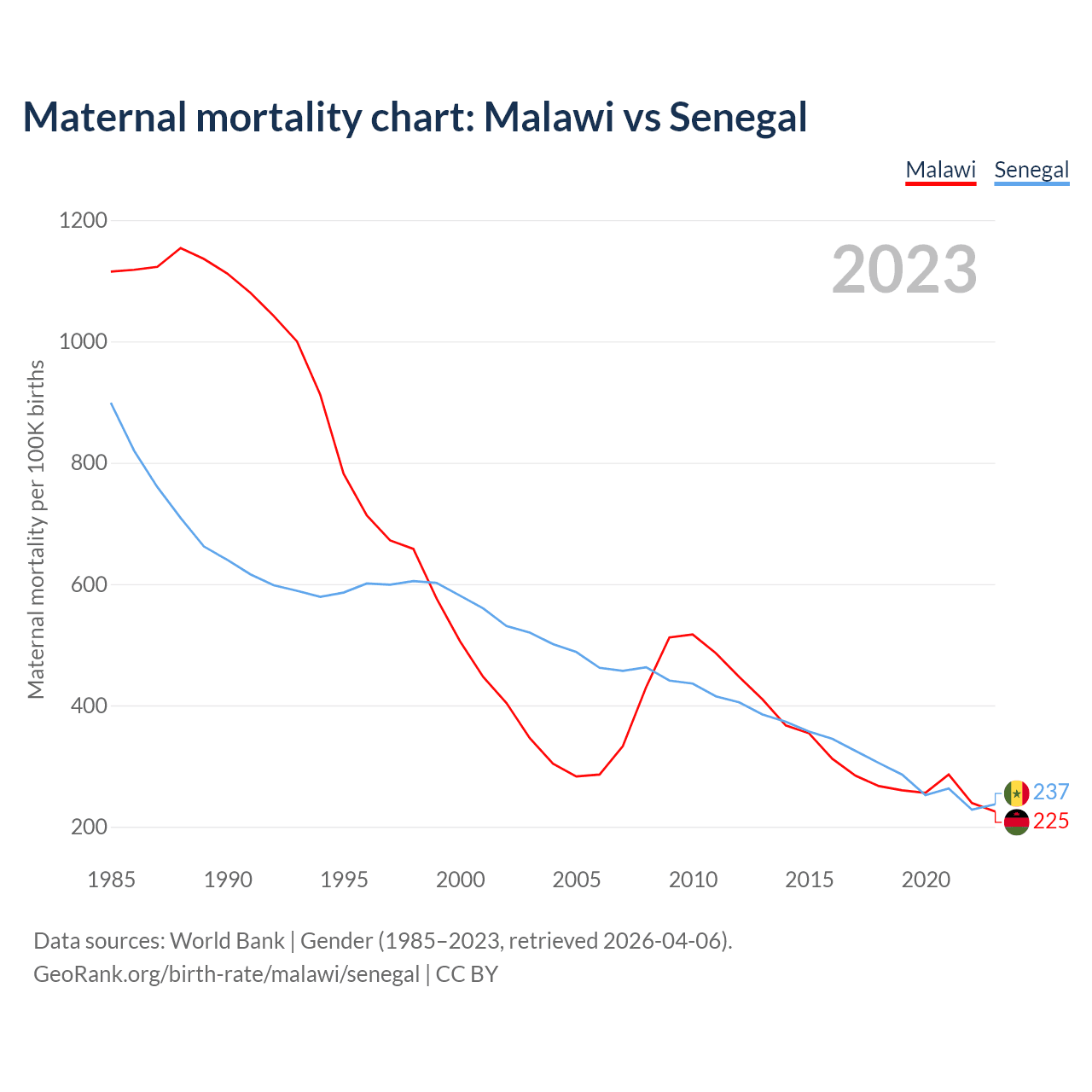 The maternal mortality rate, which is the probability of dying during childbirth or within 42 days of pregnancy termination, is 225 deaths per 100,000 live births in Malawi, compared to 237 deaths in Senegal.
