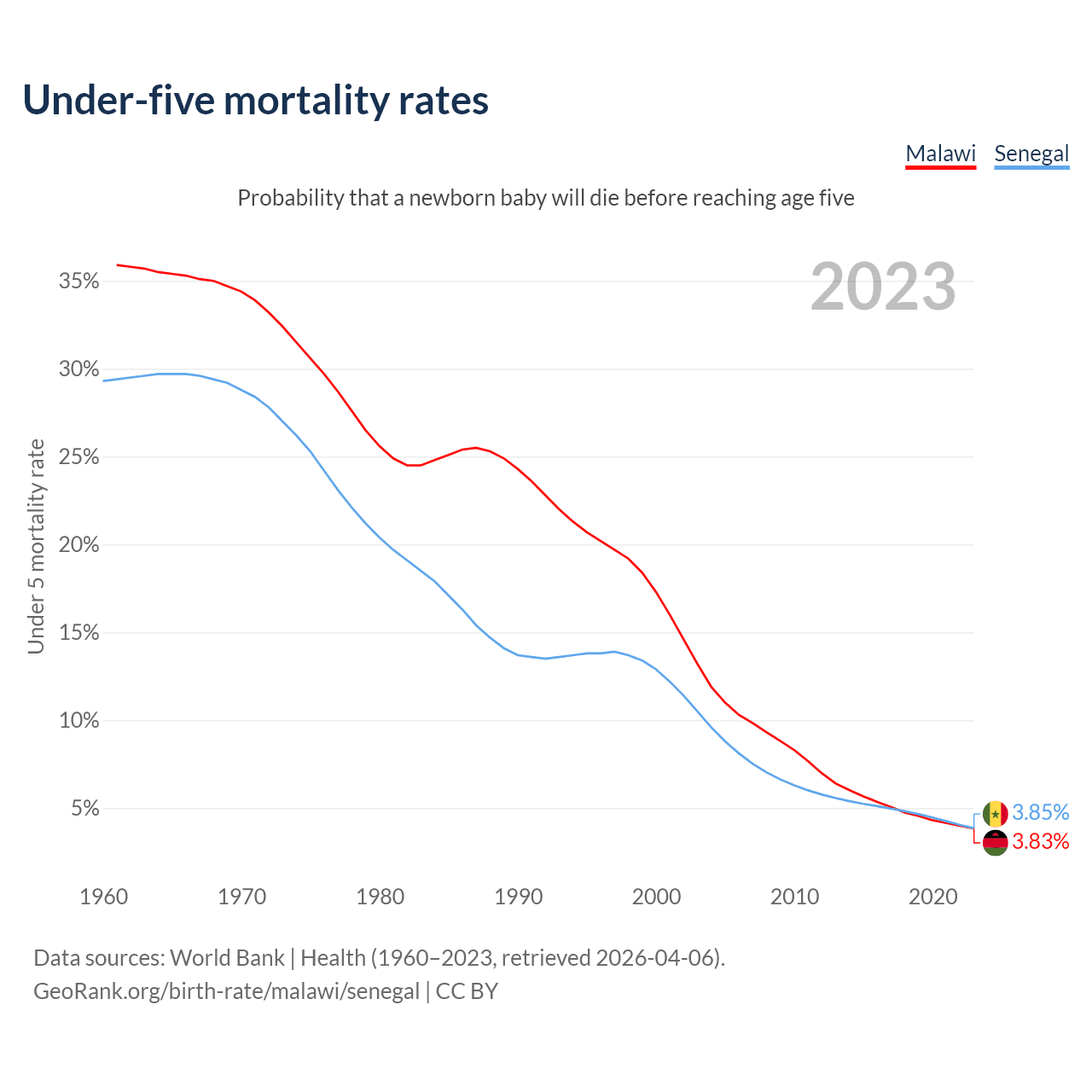 The chance that a newborn baby will die before reaching age five is 3.83% in Malawi and 3.85% in Senegal. Above is a chart with historical data on under-five mortality rates.