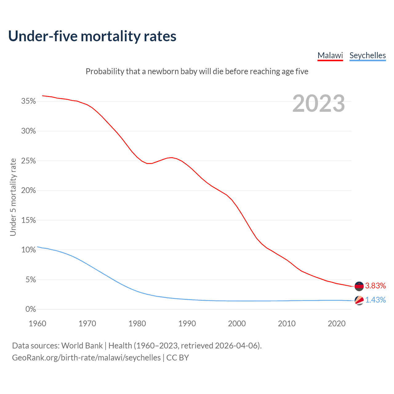 The chance that a newborn baby will die before reaching age five is 3.83% in Malawi and 1.43% in the Seychelles. Above is a chart with historical data on under-five mortality rates.