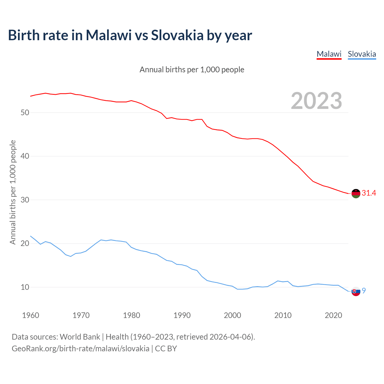 Malawi has an annual birth rate of 31.4 births per 1,000 people, compared to 9 for Slovakia. The average number of children a woman is expected to have during her lifetime — the fertility rate, is 3.65 in Malawi and 1.49 in Slovakia — 59.2% difference.