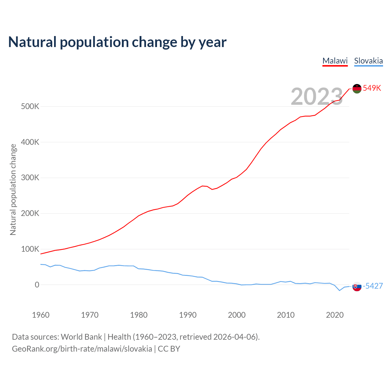 According to the latest available data on birth rates, the fertility rate in Malawi was 3.65 children per woman in 2023, compared to 1.49 in Slovakia in 2023. The replacement level is considered to be 2.1 children per woman.