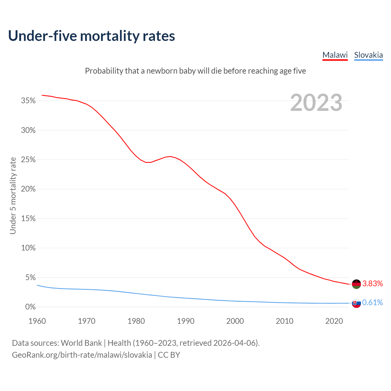 The chance that a newborn baby will die before reaching age five is 3.83% in Malawi and 0.61% in Slovakia. Above is a chart with historical data on under-five mortality rates.