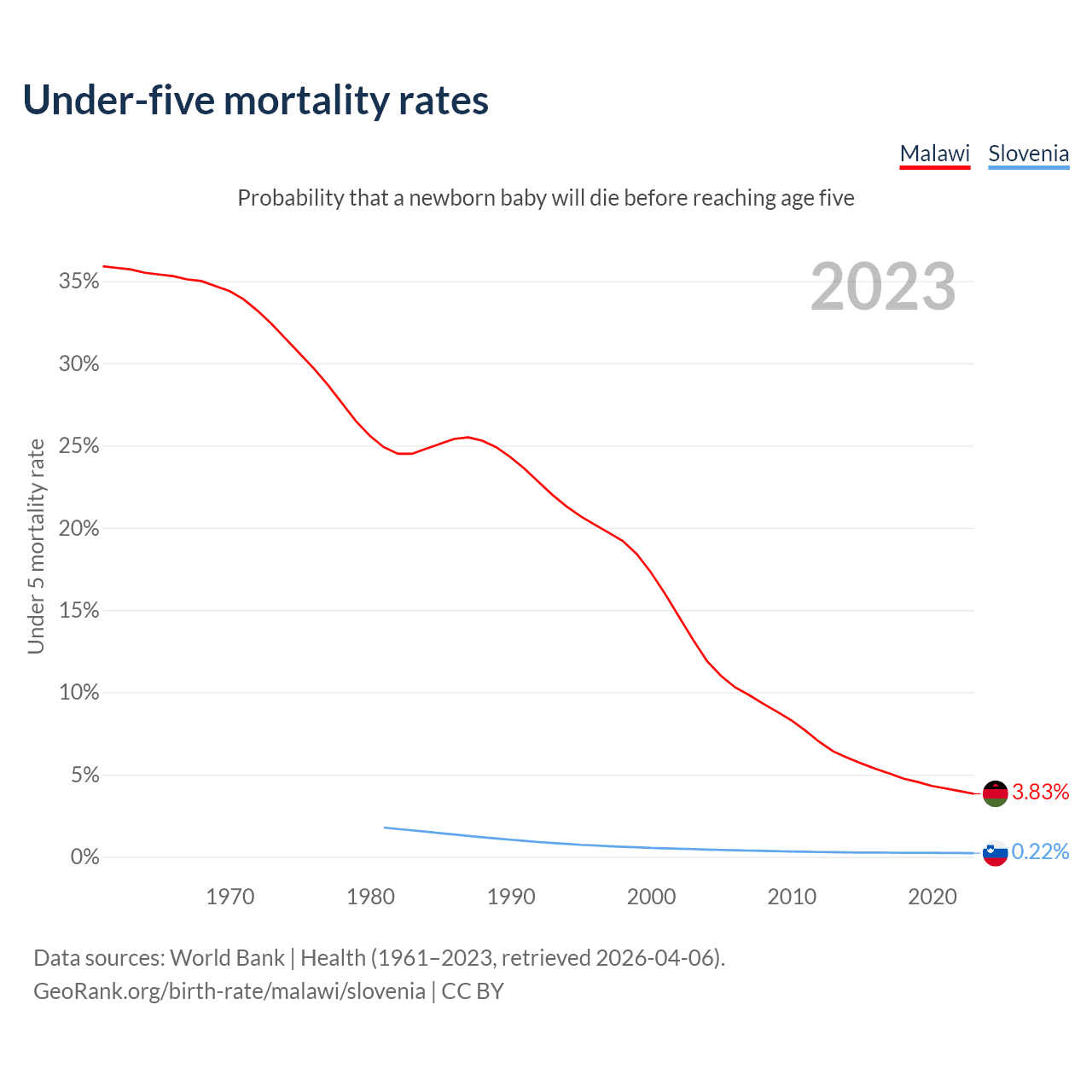 The chance that a newborn baby will die before reaching age five is 3.83% in Malawi and 0.22% in Slovenia. Above is a chart with historical data on under-five mortality rates.