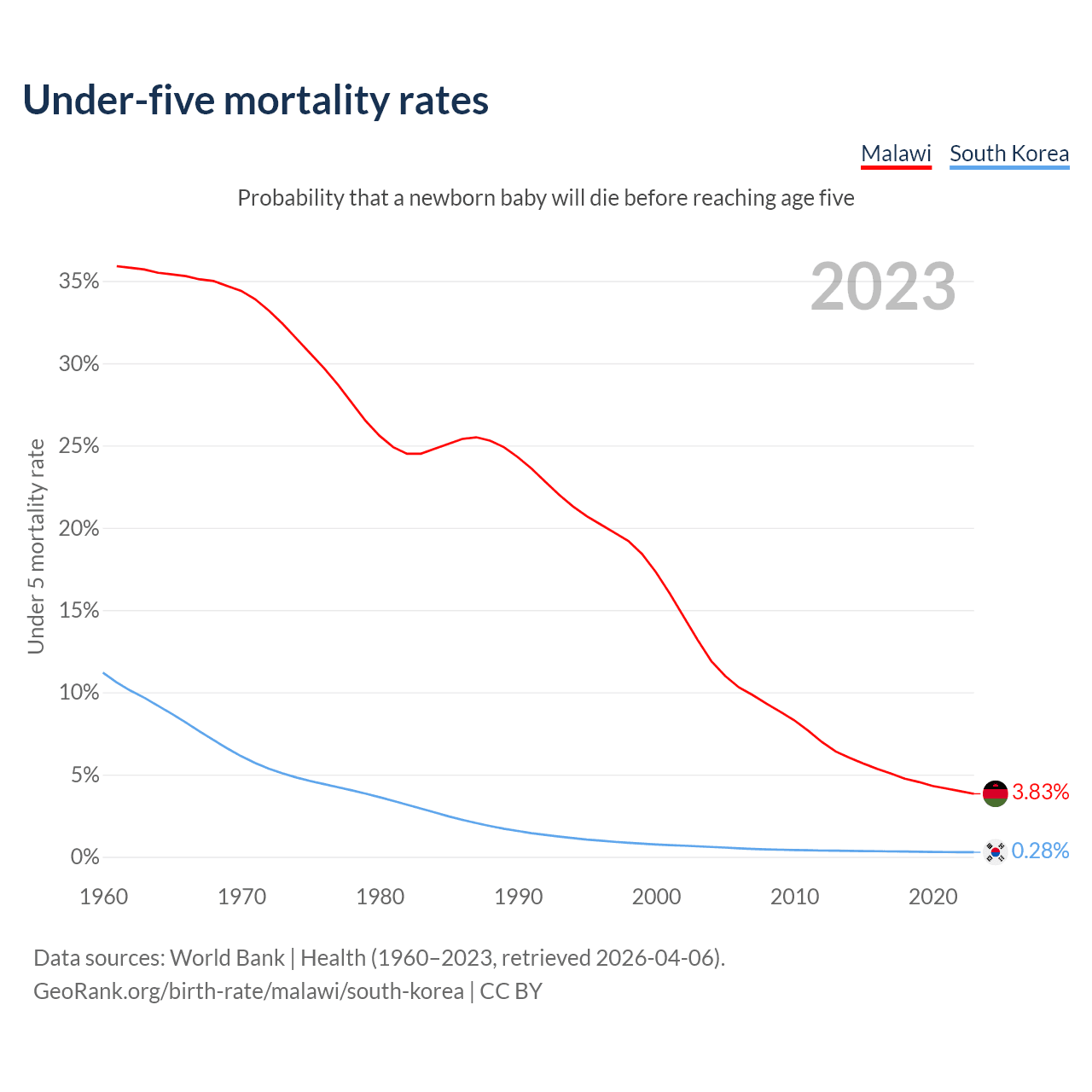 The chance that a newborn baby will die before reaching age five is 3.83% in Malawi and 0.28% in South Korea. Above is a chart with historical data on under-five mortality rates.