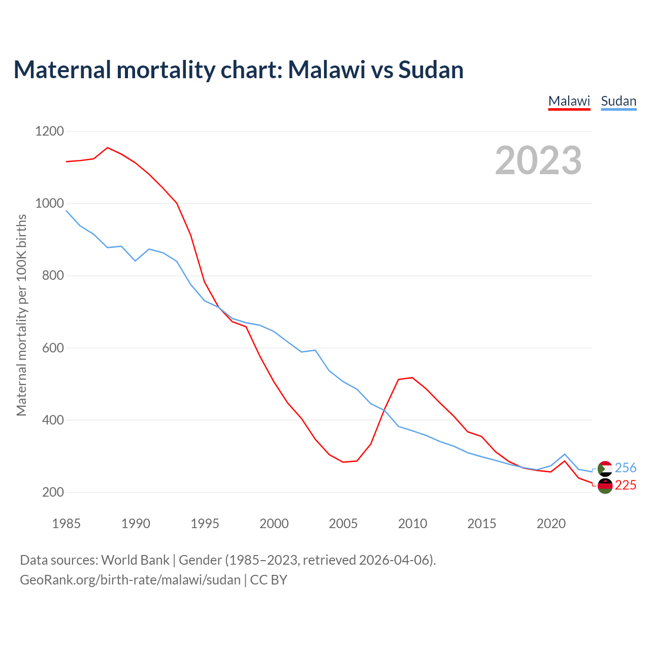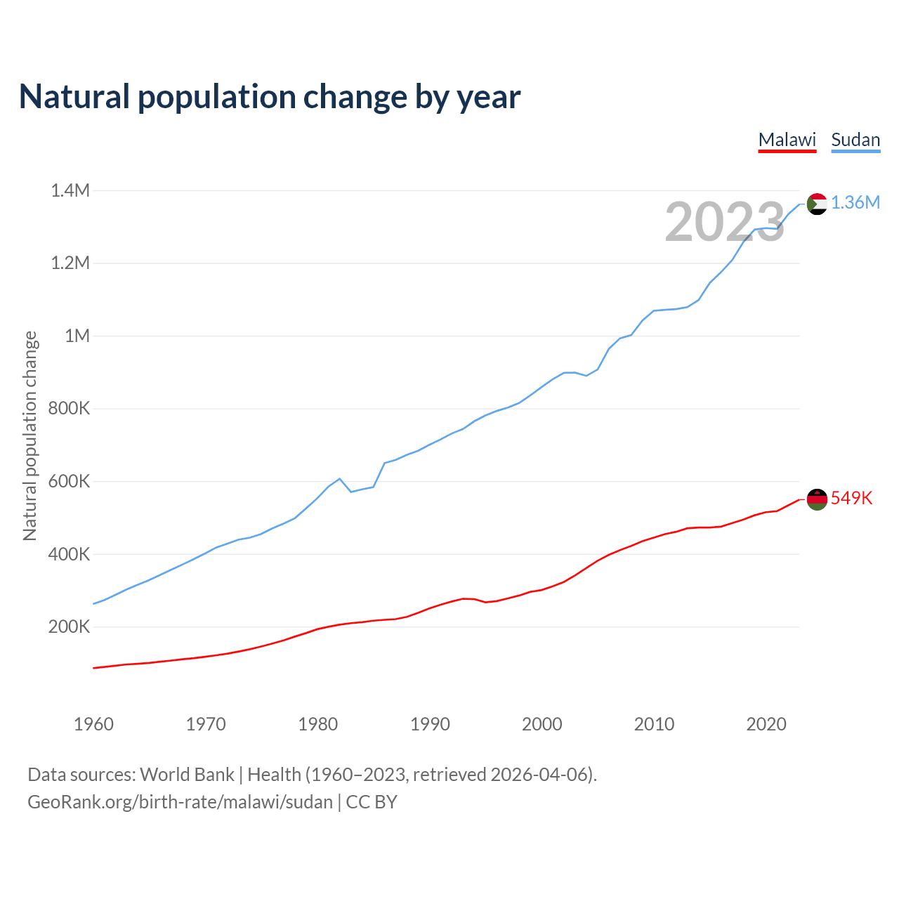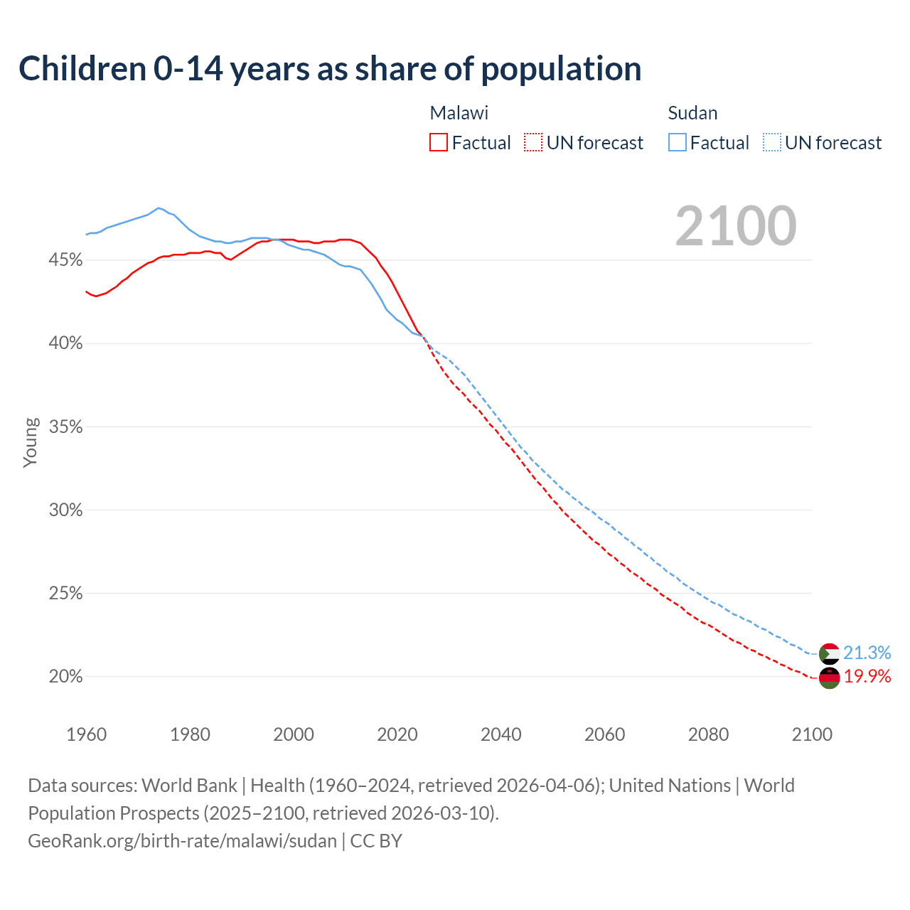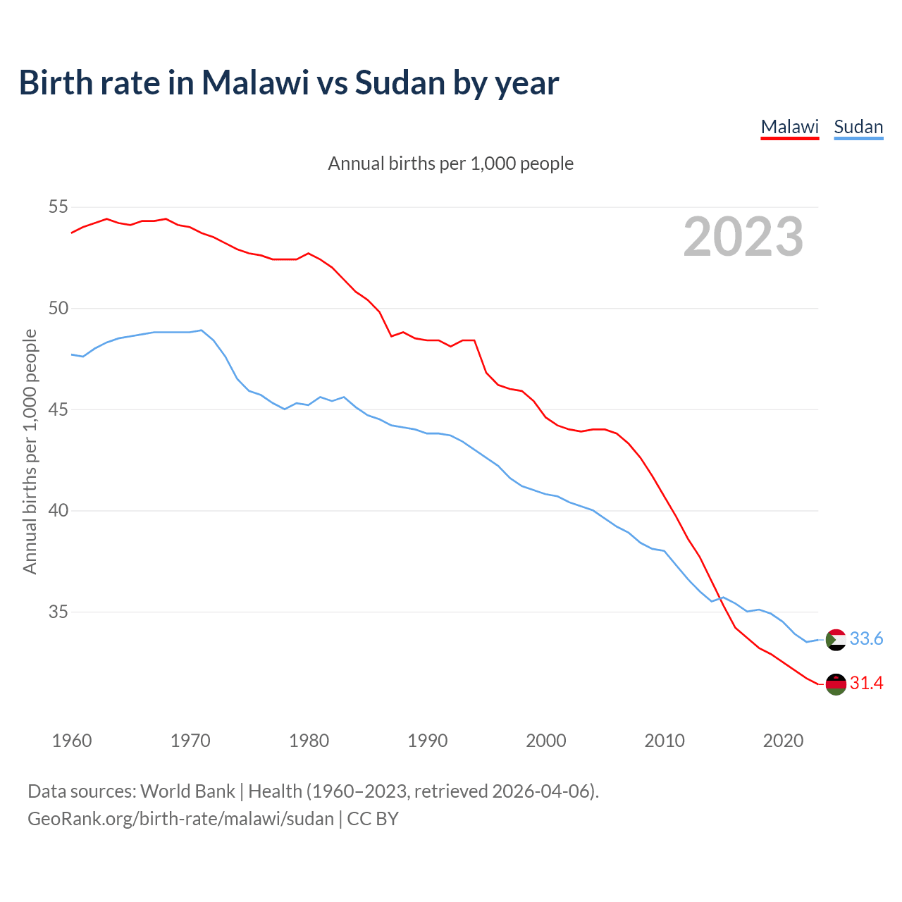 According to the latest available data on birth rates, the fertility rate in Malawi was 3.65 children per woman in 2023, compared to 4.32 in Sudan in 2023. The replacement level is considered to be 2.1 children per woman.