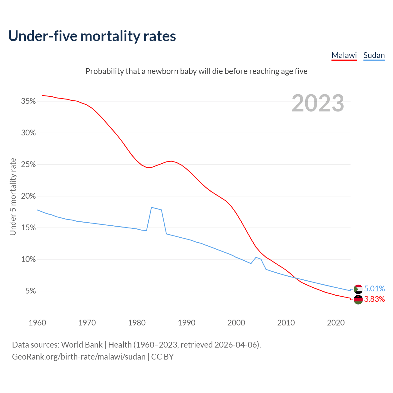 The chance that a newborn baby will die before reaching age five is 3.83% in Malawi and 5.01% in Sudan. Above is a chart with historical data on under-five mortality rates.