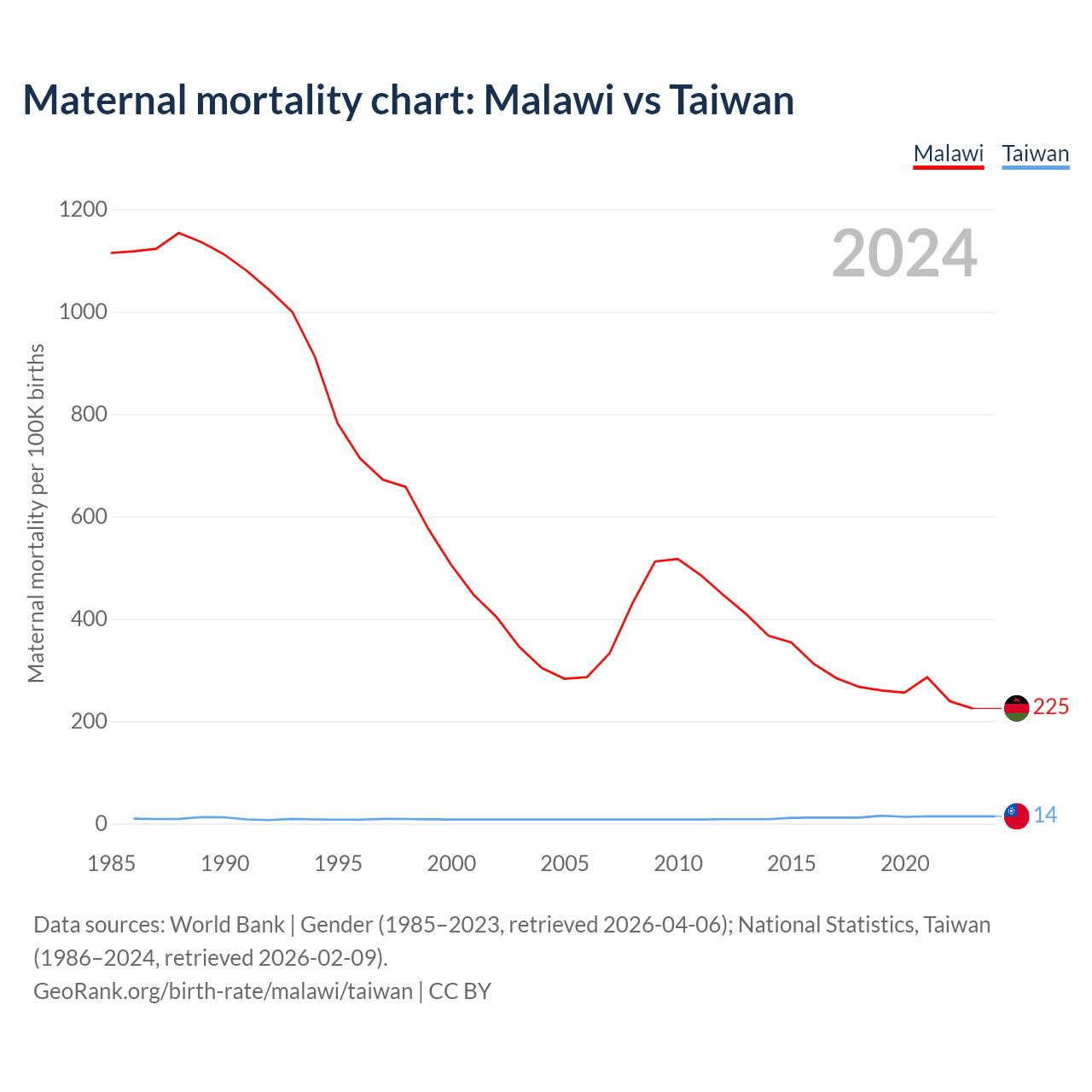 The maternal mortality rate, which is the probability of dying during childbirth or within 42 days of pregnancy termination, is 225 deaths per 100,000 live births in Malawi, compared to 14 deaths in Taiwan.