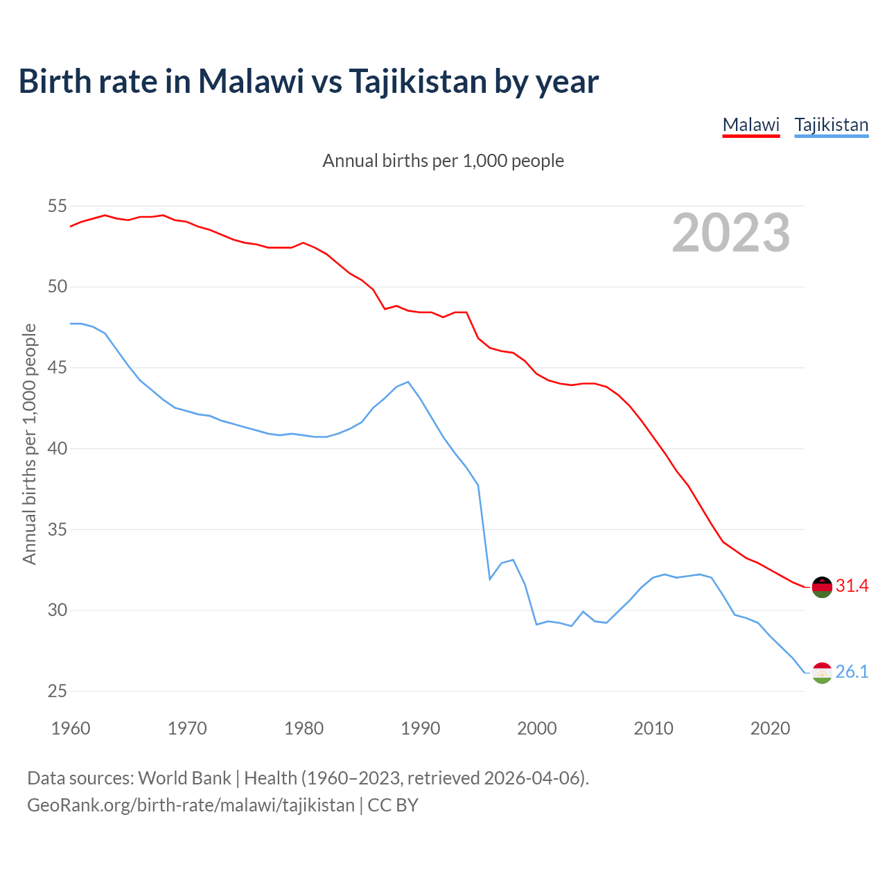 Malawi has an annual birth rate of 31.4 births per 1,000 people, compared to 26.1 for Tajikistan. The average number of children a woman is expected to have during her lifetime — the fertility rate, is 3.65 in Malawi and 3.07 in Tajikistan — 15.8% difference.