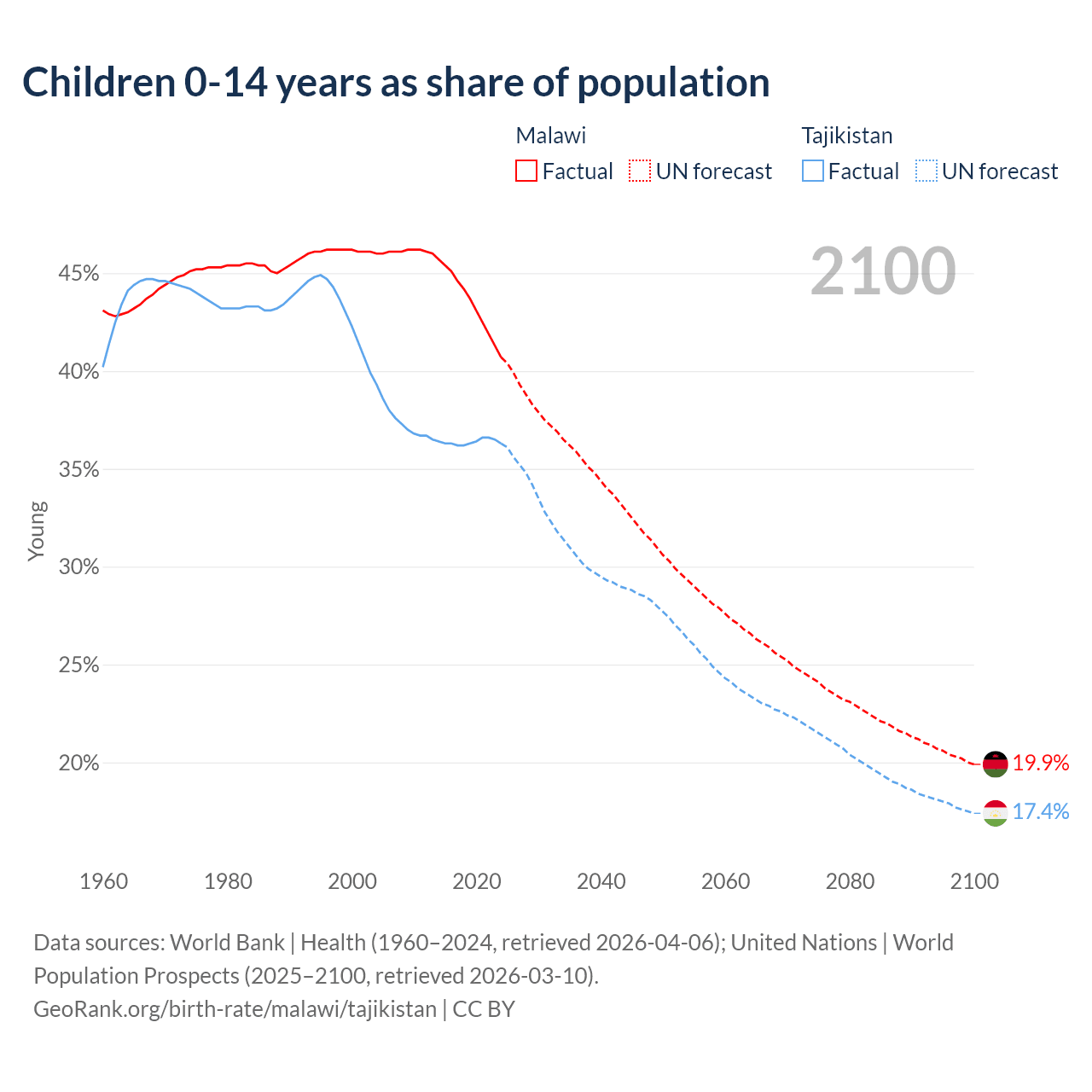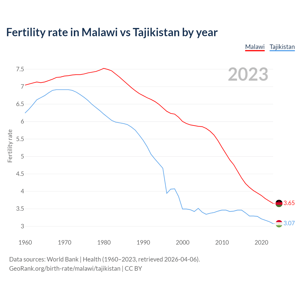 According to the latest available data on birth rates, the fertility rate in Malawi was 3.65 children per woman in 2023, compared to 3.07 in Tajikistan in 2023. The replacement level is considered to be 2.1 children per woman.