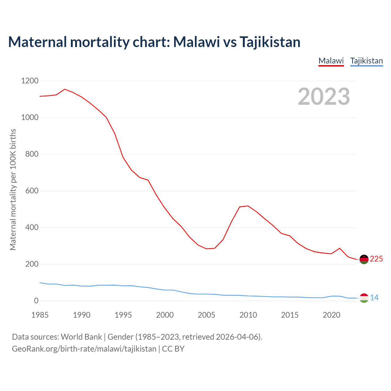 The maternal mortality rate, which is the probability of dying during childbirth or within 42 days of pregnancy termination, is 225 deaths per 100,000 live births in Malawi, compared to 14 deaths in Tajikistan.