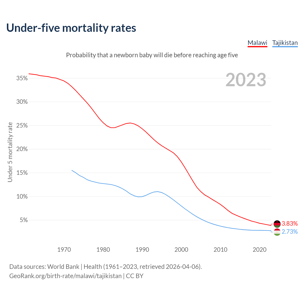The chance that a newborn baby will die before reaching age five is 3.83% in Malawi and 2.73% in Tajikistan. Above is a chart with historical data on under-five mortality rates.