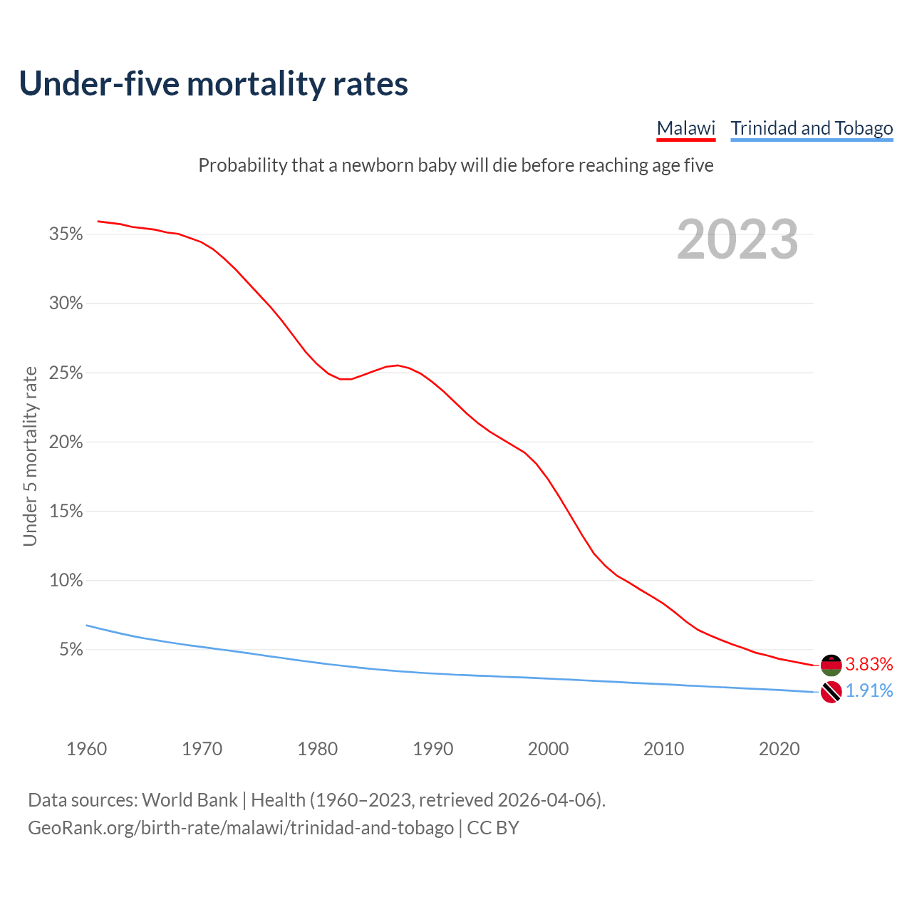 The chance that a newborn baby will die before reaching age five is 3.83% in Malawi and 1.91% in Trinidad and Tobago. Above is a chart with historical data on under-five mortality rates.