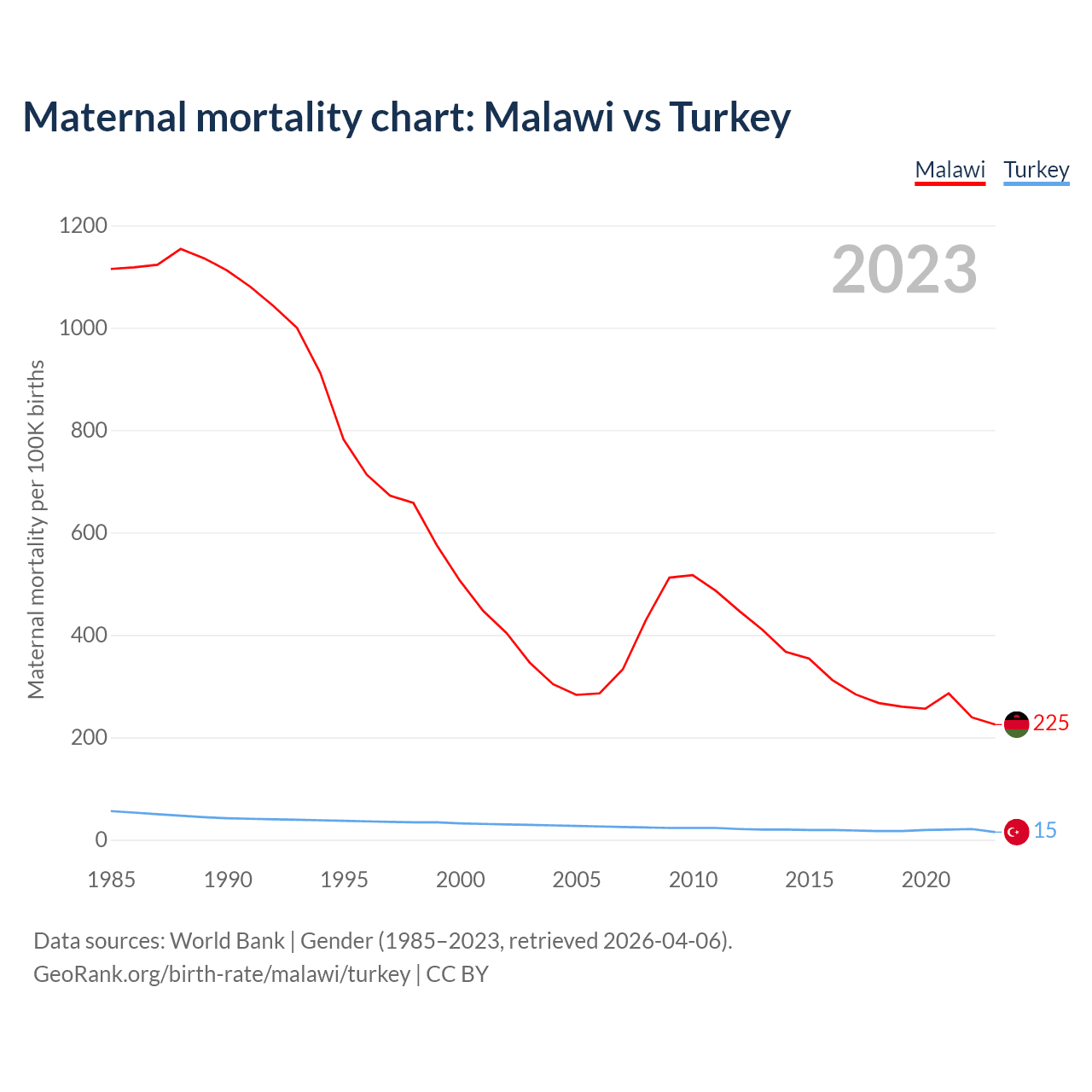 The maternal mortality rate, which is the probability of dying during childbirth or within 42 days of pregnancy termination, is 225 deaths per 100,000 live births in Malawi, compared to 15 deaths in Turkey.