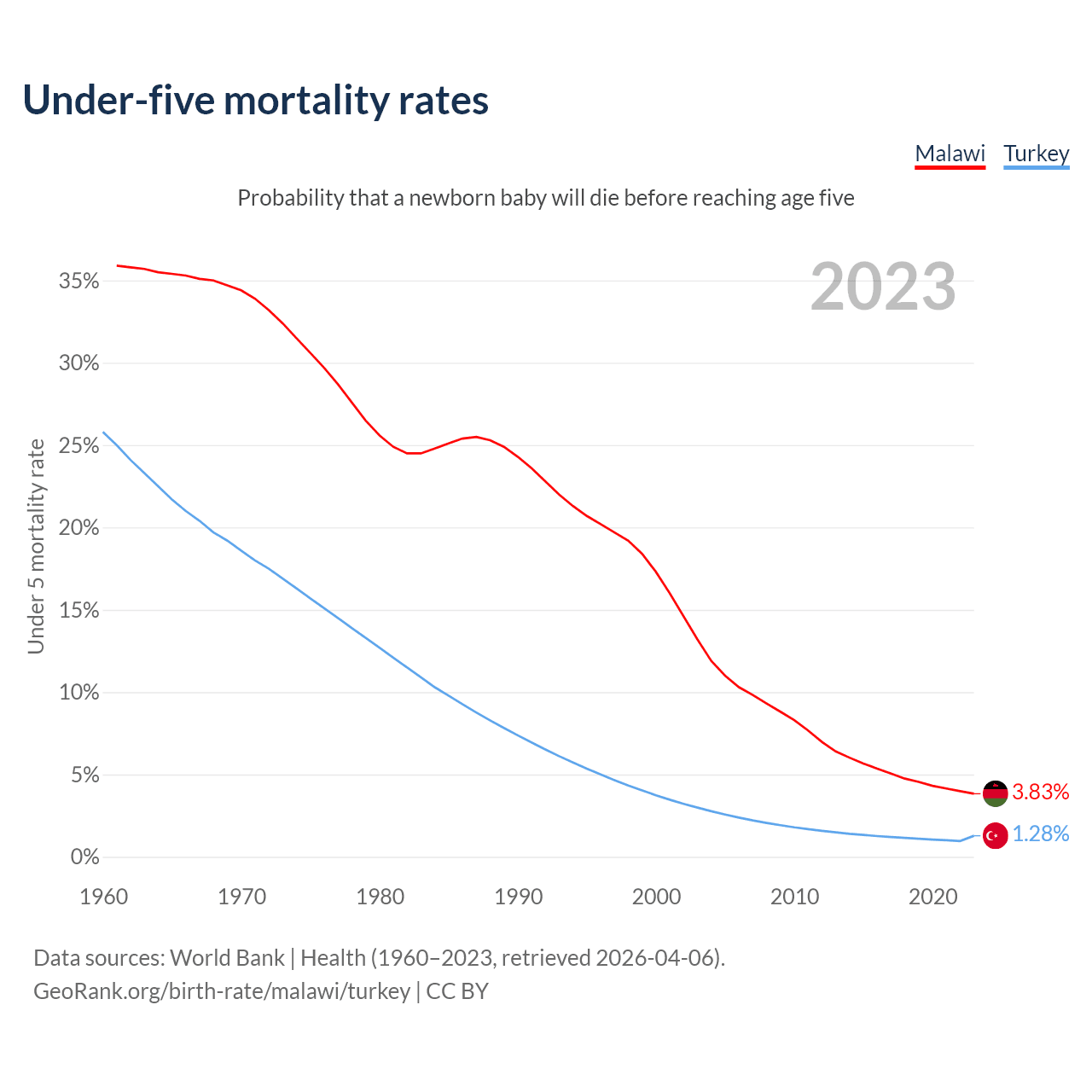 The chance that a newborn baby will die before reaching age five is 3.83% in Malawi and 1.28% in Turkey. Above is a chart with historical data on under-five mortality rates.