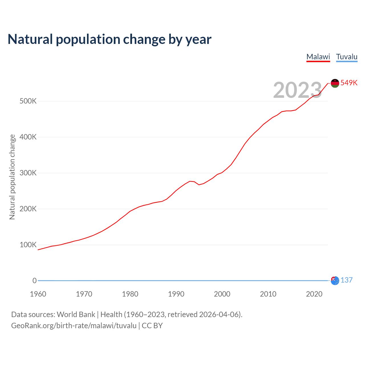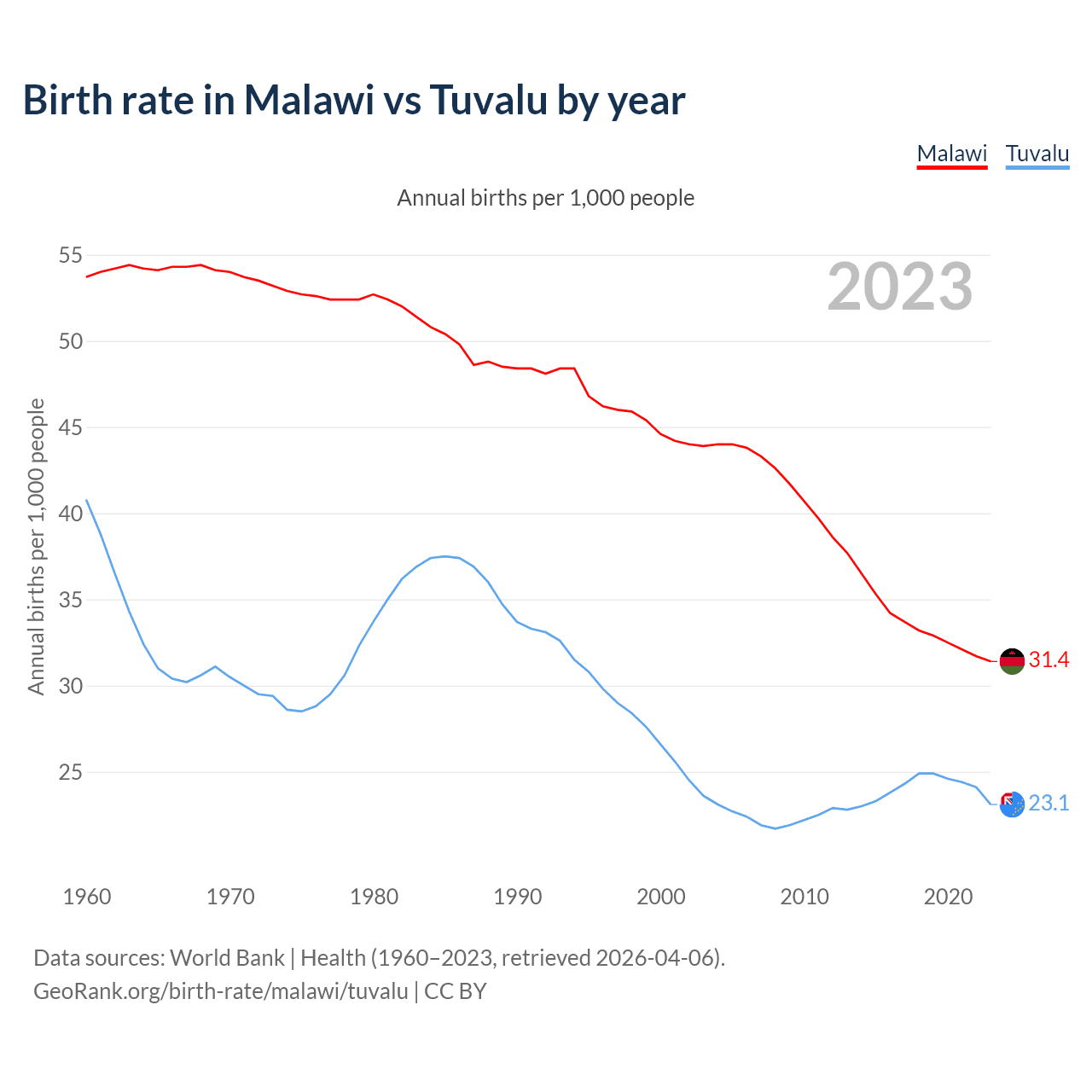 Malawi has an annual birth rate of 31.4 births per 1,000 people, compared to 23.1 for Tuvalu. The average number of children a woman is expected to have during her lifetime — the fertility rate, is 3.65 in Malawi and 3.21 in Tuvalu — 12.1% difference.