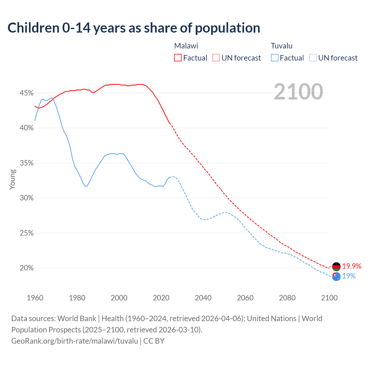 According to the latest available data on birth rates, the fertility rate in Malawi was 3.65 children per woman in 2023, compared to 3.21 in Tuvalu in 2023. The replacement level is considered to be 2.1 children per woman.