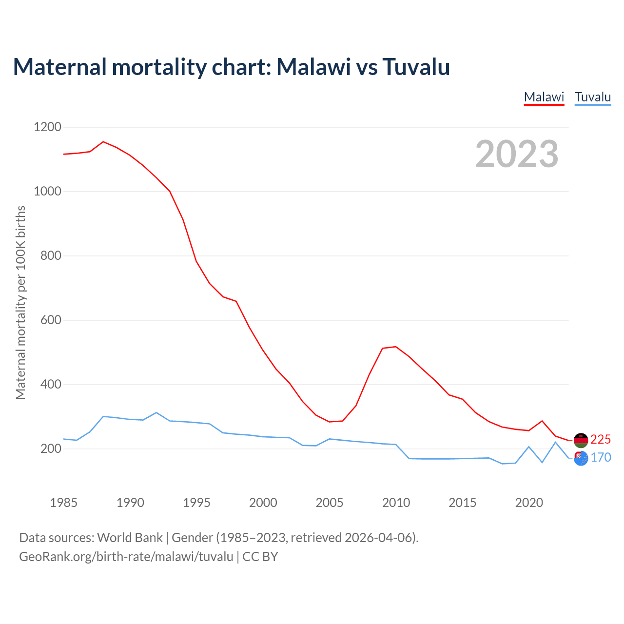 The maternal mortality rate, which is the probability of dying during childbirth or within 42 days of pregnancy termination, is 225 deaths per 100,000 live births in Malawi, compared to 170 deaths in Tuvalu.
