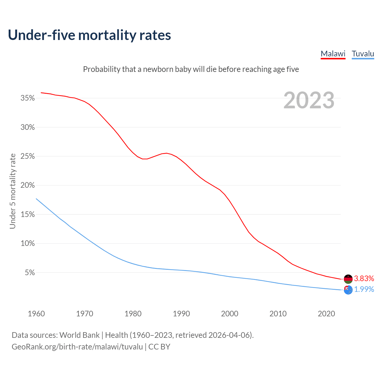 The chance that a newborn baby will die before reaching age five is 3.83% in Malawi and 1.99% in Tuvalu. Above is a chart with historical data on under-five mortality rates.