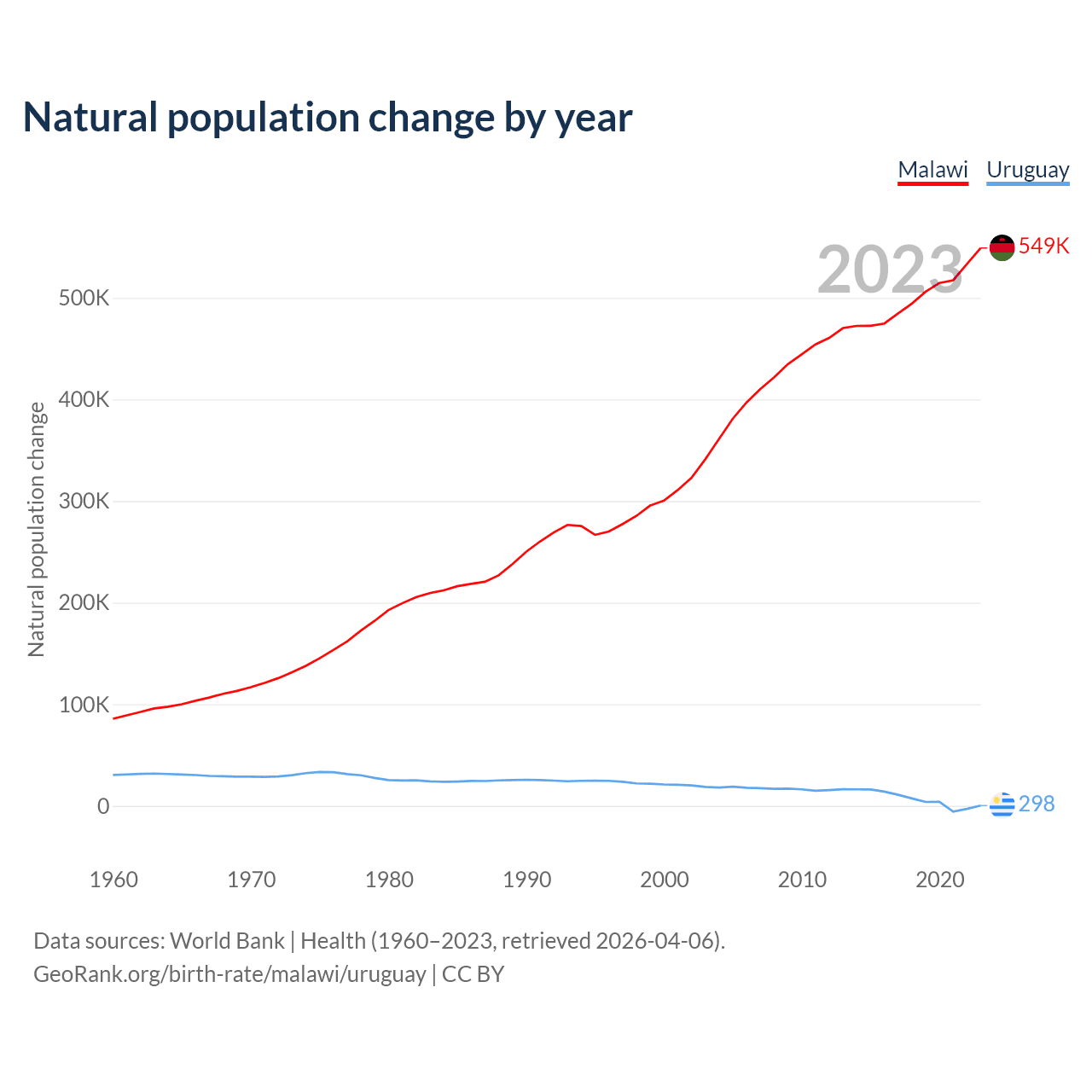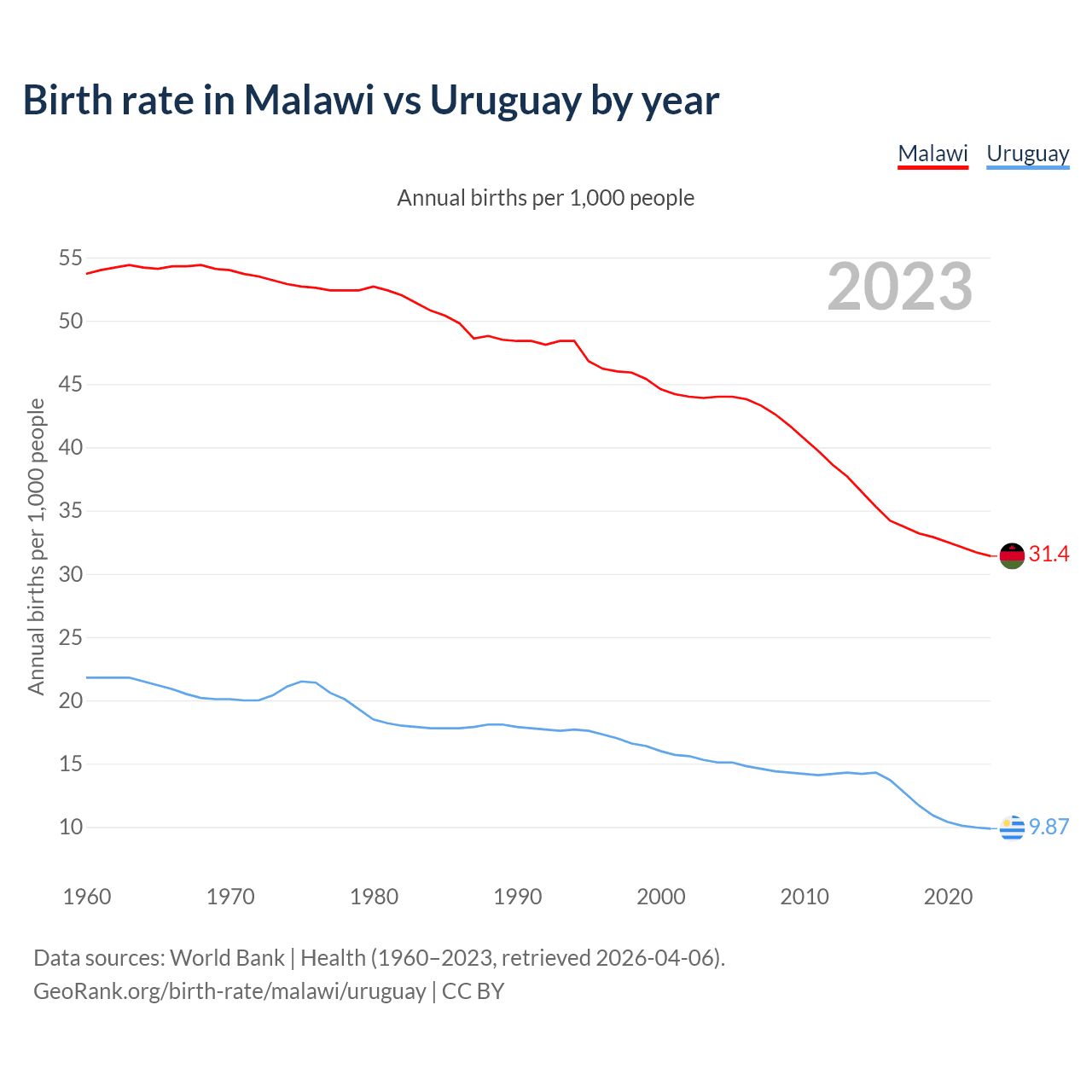 Malawi has an annual birth rate of 31.4 births per 1,000 people, compared to 9.87 for Uruguay. The average number of children a woman is expected to have during her lifetime — the fertility rate, is 3.65 in Malawi and 1.41 in Uruguay — 61.4% difference.