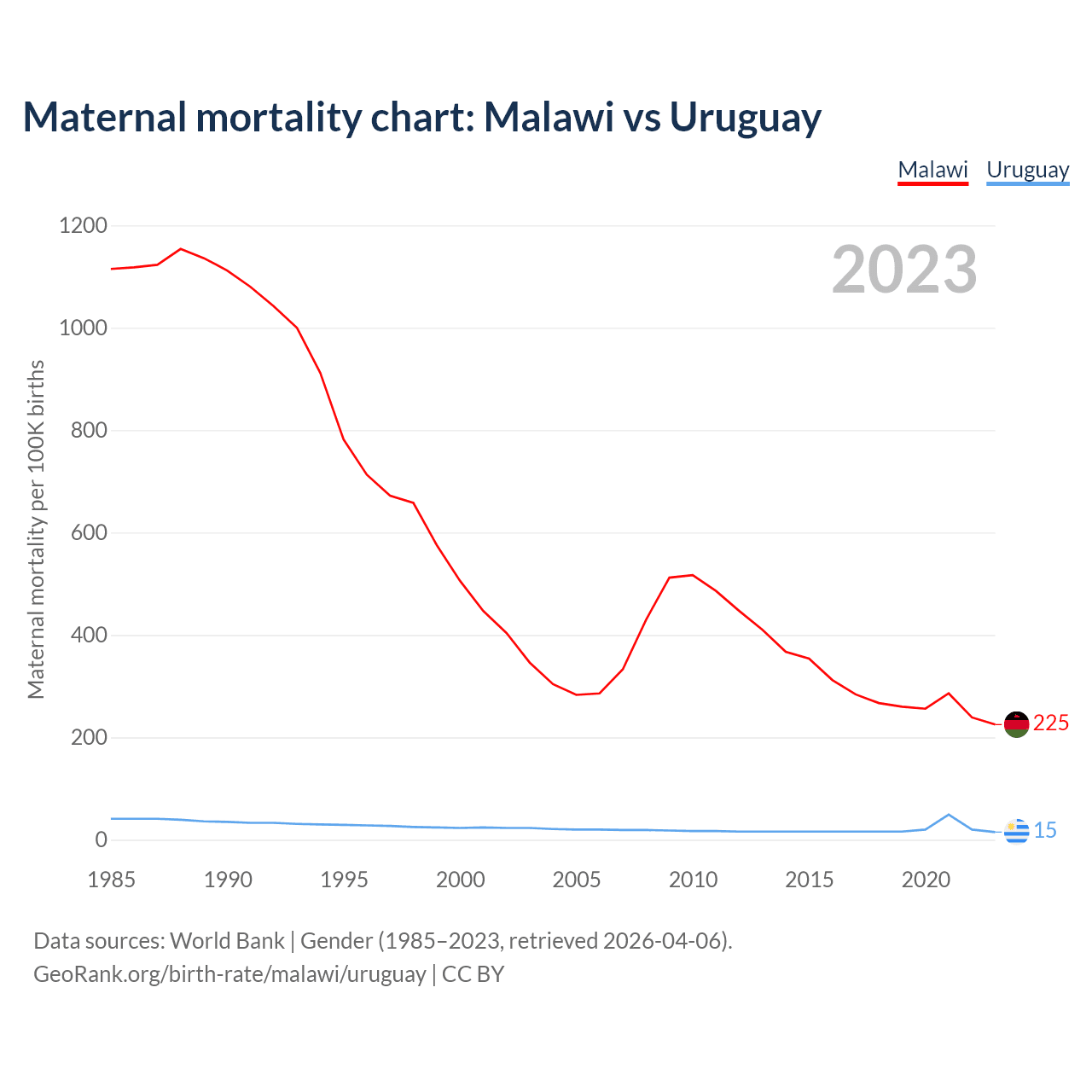 The maternal mortality rate, which is the probability of dying during childbirth or within 42 days of pregnancy termination, is 225 deaths per 100,000 live births in Malawi, compared to 15 deaths in Uruguay.