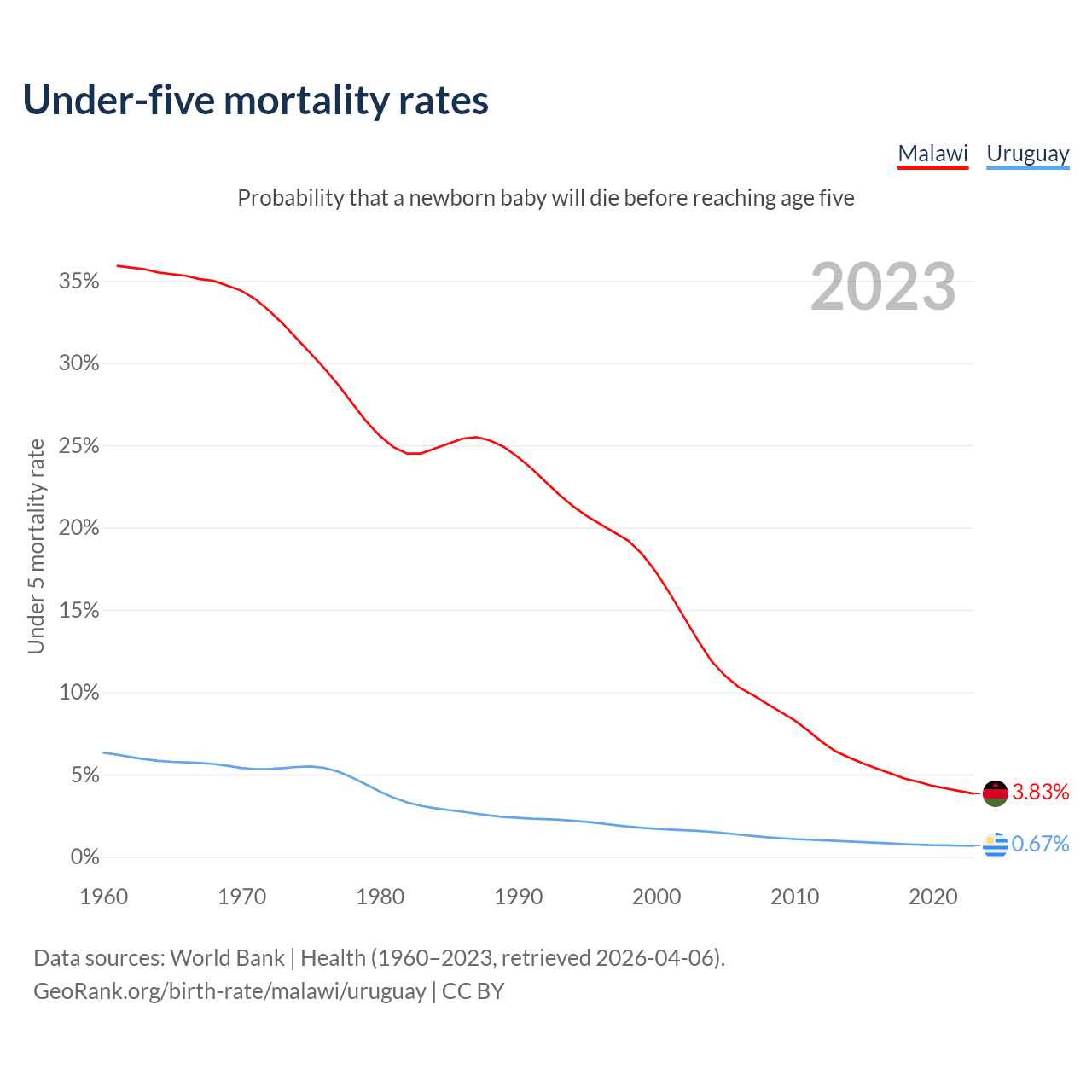 The chance that a newborn baby will die before reaching age five is 3.83% in Malawi and 0.67% in Uruguay. Above is a chart with historical data on under-five mortality rates.
