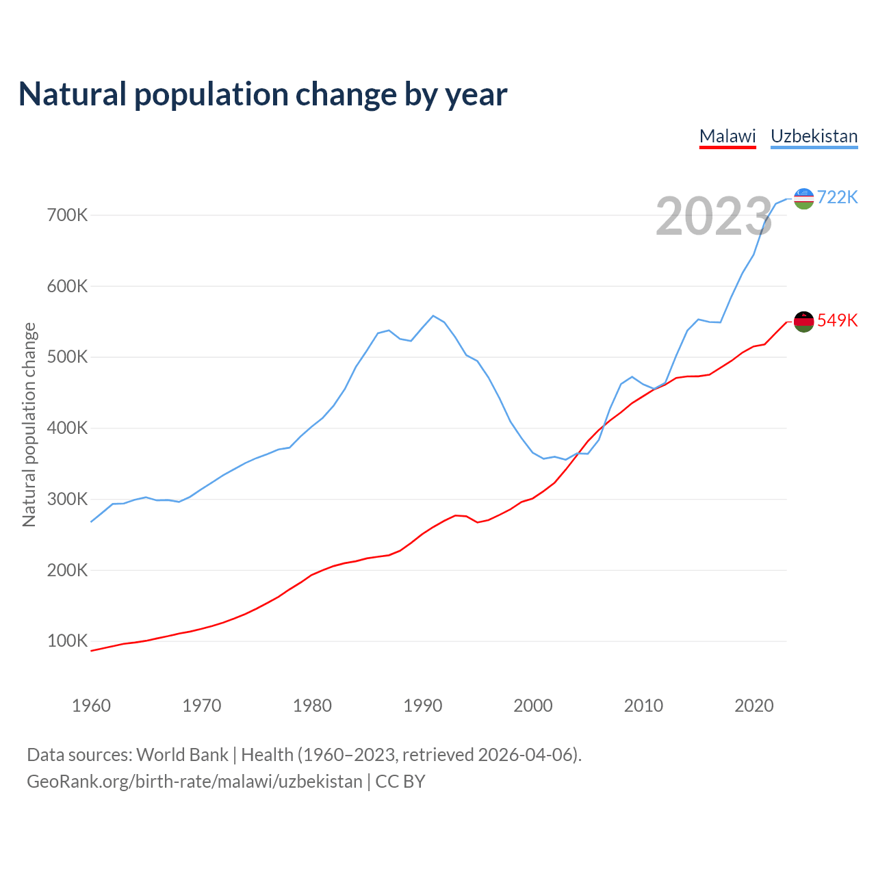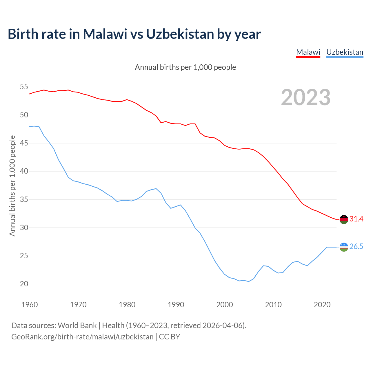 Malawi has an annual birth rate of 31.4 births per 1,000 people, compared to 26.5 for Uzbekistan. The average number of children a woman is expected to have during her lifetime — the fertility rate, is 3.65 in Malawi and 3.5 in Uzbekistan — 4.06% difference.