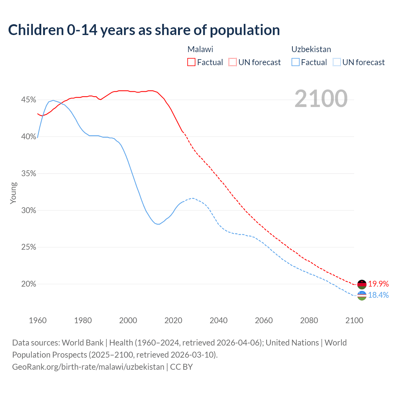 According to the latest available data on birth rates, the fertility rate in Malawi was 3.65 children per woman in 2023, compared to 3.5 in Uzbekistan in 2023. The replacement level is considered to be 2.1 children per woman.