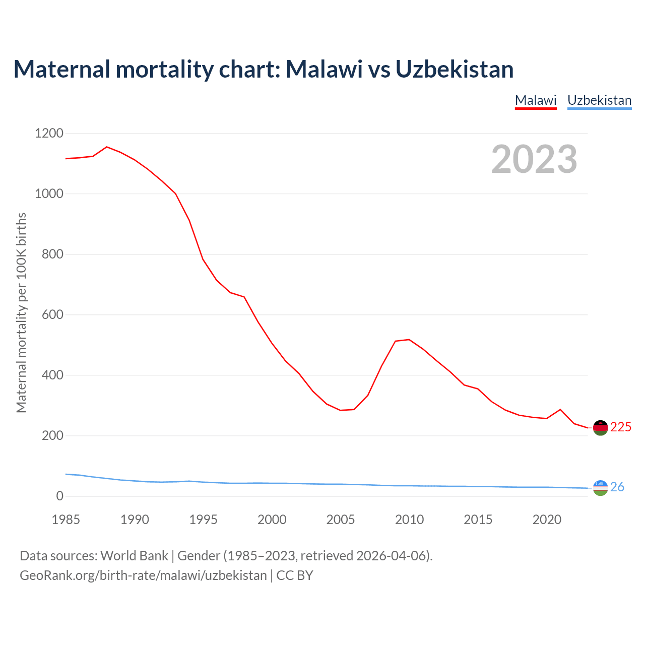 The maternal mortality rate, which is the probability of dying during childbirth or within 42 days of pregnancy termination, is 225 deaths per 100,000 live births in Malawi, compared to 26 deaths in Uzbekistan.
