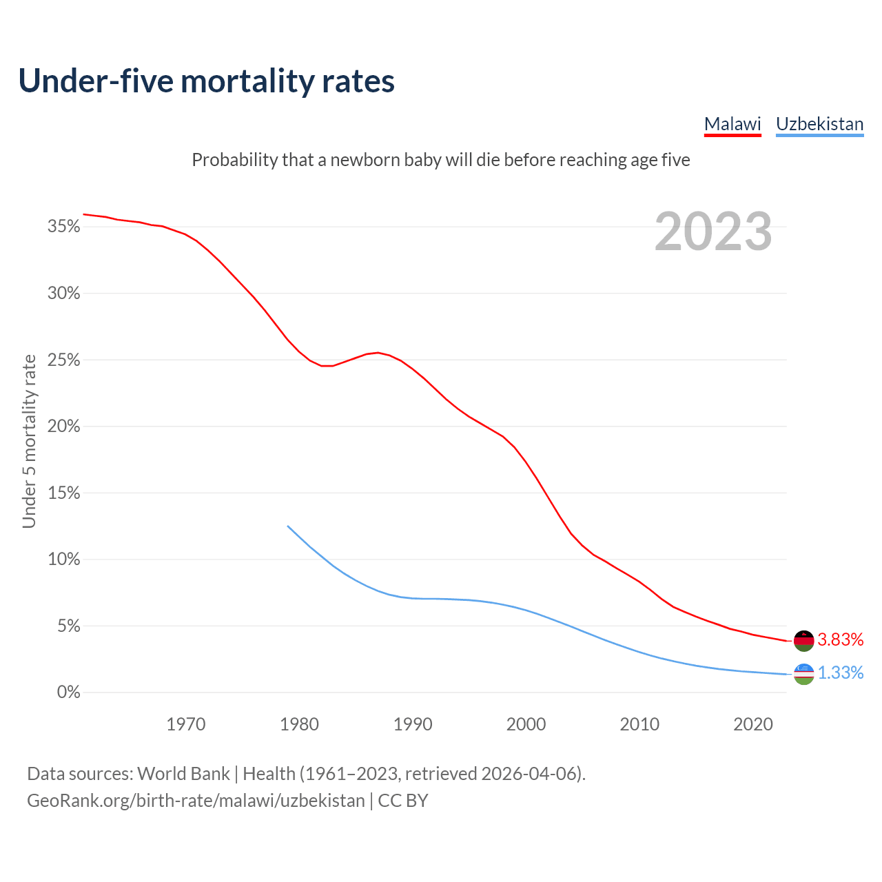 The chance that a newborn baby will die before reaching age five is 3.83% in Malawi and 1.33% in Uzbekistan. Above is a chart with historical data on under-five mortality rates.
