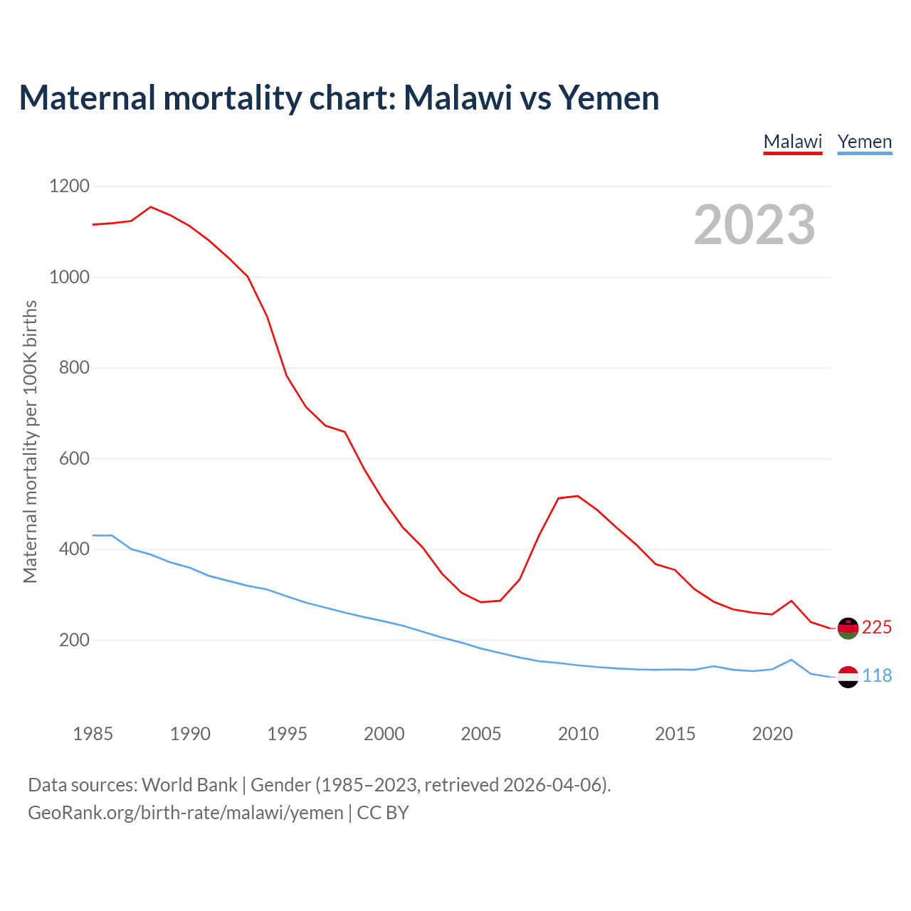 The maternal mortality rate, which is the probability of dying during childbirth or within 42 days of pregnancy termination, is 225 deaths per 100,000 live births in Malawi, compared to 118 deaths in Yemen.