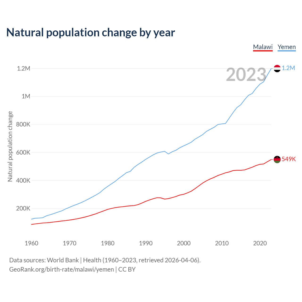 Malawi has an annual birth rate of 31.4 births per 1,000 people, compared to 35.2 for Yemen. The average number of children a woman is expected to have during her lifetime — the fertility rate, is 3.65 in Malawi and 4.59 in Yemen — 25.8% difference.
