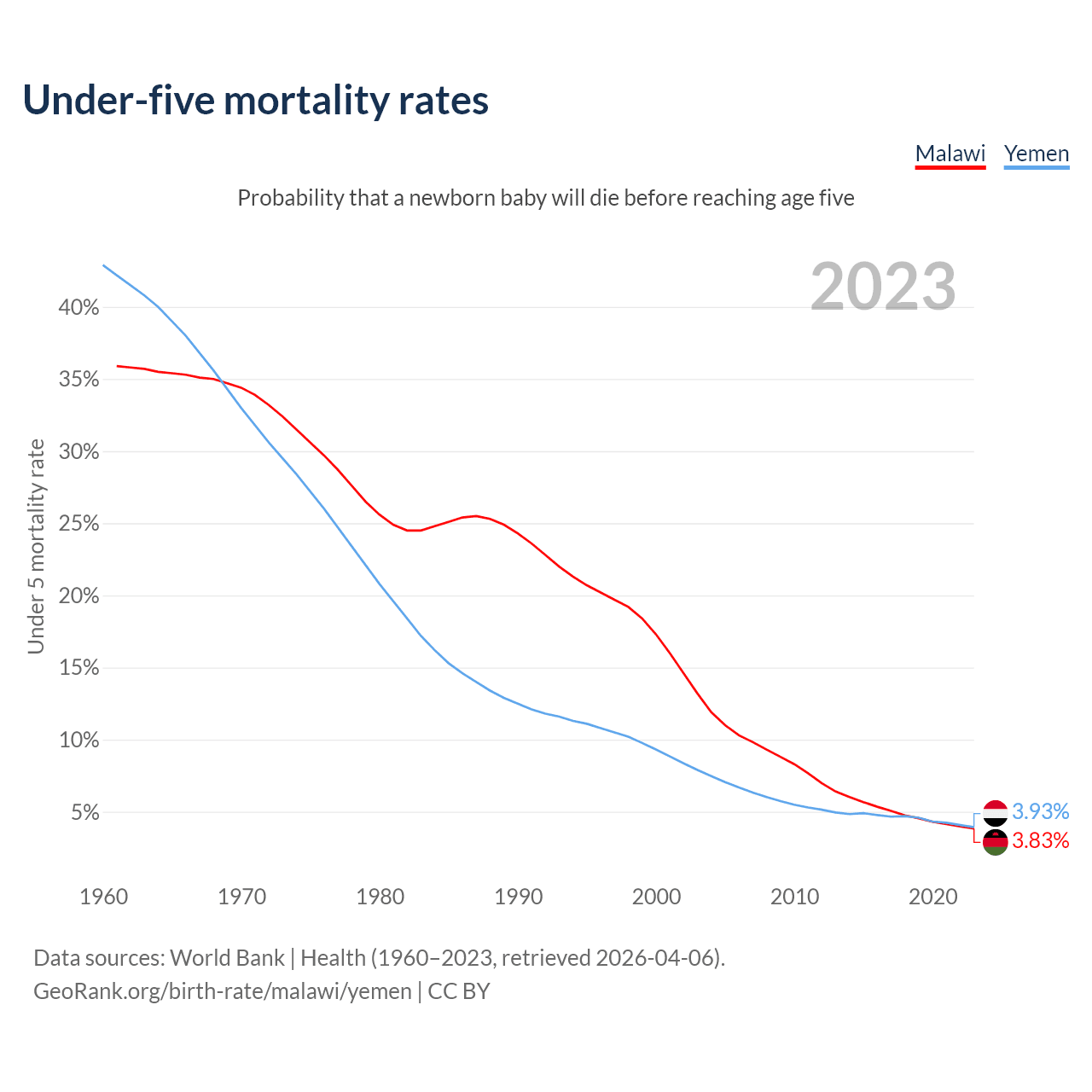 The chance that a newborn baby will die before reaching age five is 3.83% in Malawi and 3.93% in Yemen. Above is a chart with historical data on under-five mortality rates.