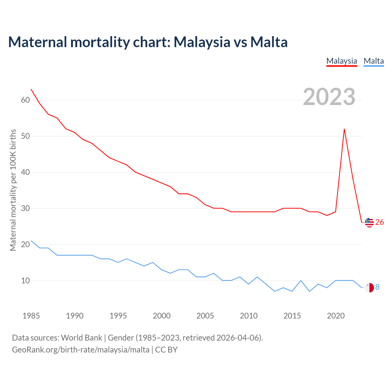 The maternal mortality rate, which is the probability of dying during childbirth or within 42 days of pregnancy termination, is 26 deaths per 100,000 live births in Malaysia, compared to 8 deaths in Malta.
