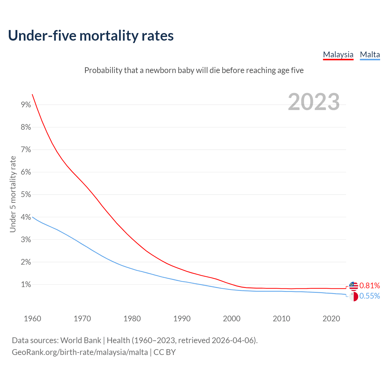 The chance that a newborn baby will die before reaching age five is 0.81% in Malaysia and 0.55% in Malta. Above is a chart with historical data on under-five mortality rates.
