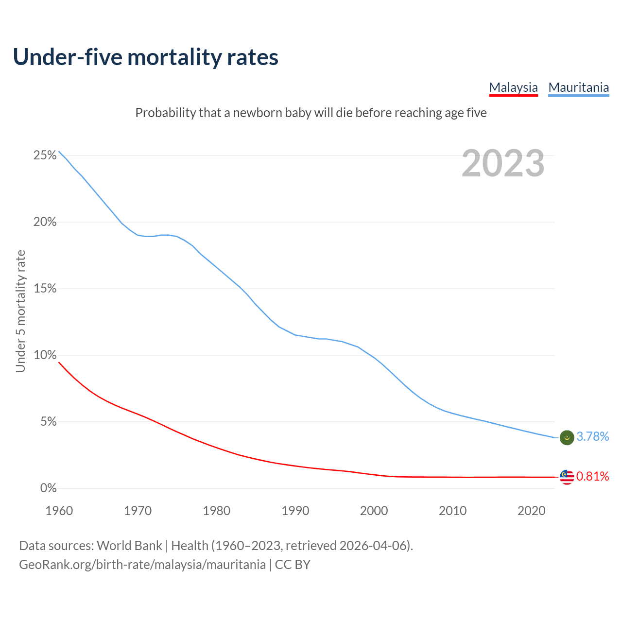 The chance that a newborn baby will die before reaching age five is 0.81% in Malaysia and 3.78% in Mauritania. Above is a chart with historical data on under-five mortality rates.