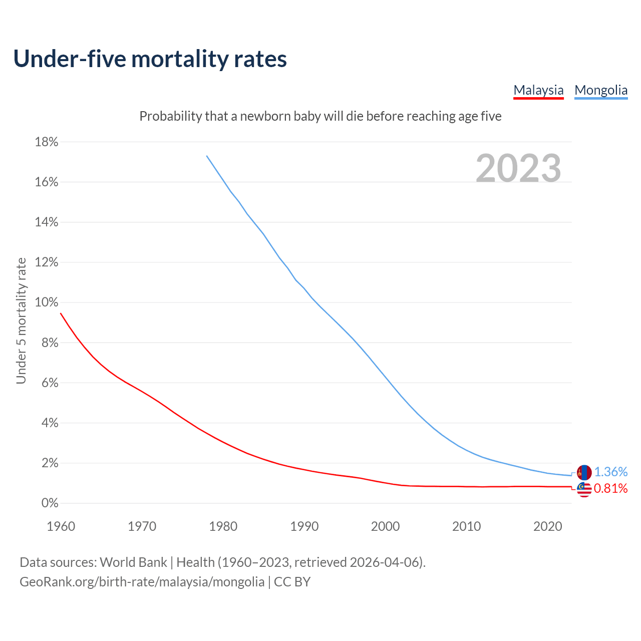 The chance that a newborn baby will die before reaching age five is 0.81% in Malaysia and 1.36% in Mongolia. Above is a chart with historical data on under-five mortality rates.