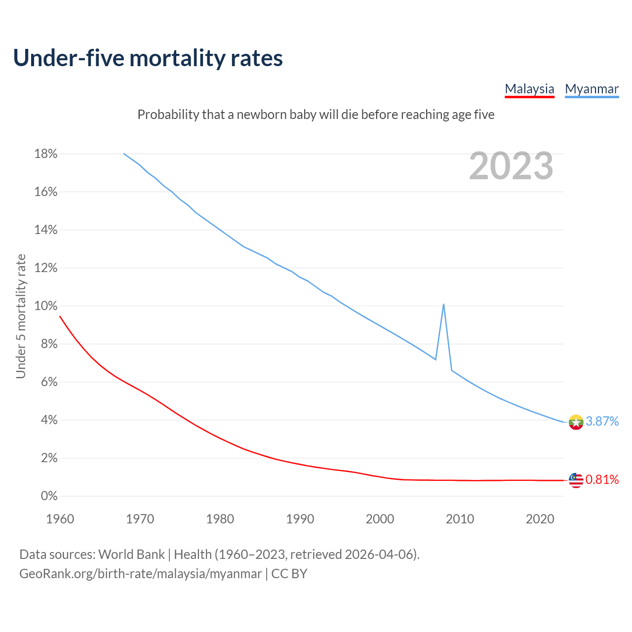 The chance that a newborn baby will die before reaching age five is 0.81% in Malaysia and 3.87% in Myanmar. Above is a chart with historical data on under-five mortality rates.