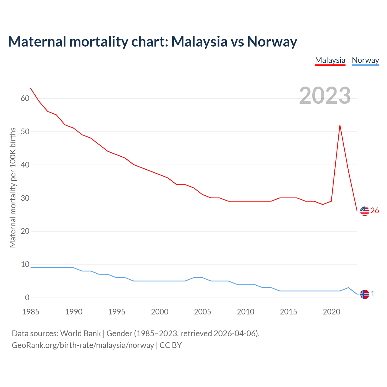 The maternal mortality rate, which is the probability of dying during childbirth or within 42 days of pregnancy termination, is 26 deaths per 100,000 live births in Malaysia, compared to 1 deaths in Norway.