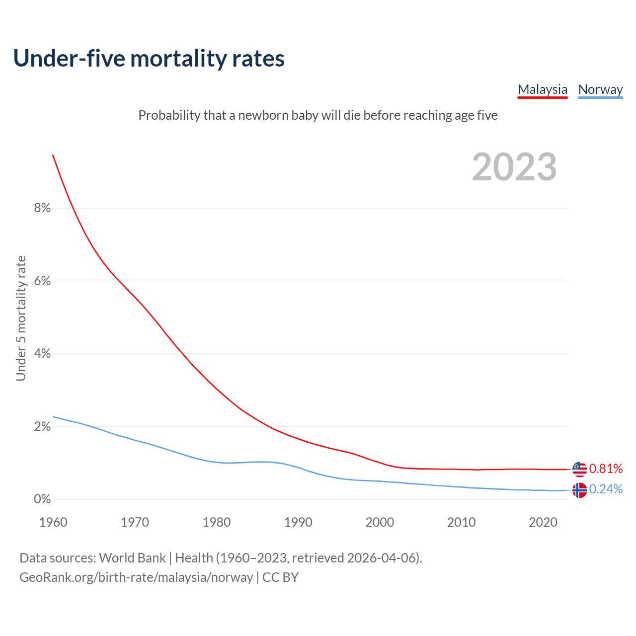 The chance that a newborn baby will die before reaching age five is 0.81% in Malaysia and 0.24% in Norway. Above is a chart with historical data on under-five mortality rates.