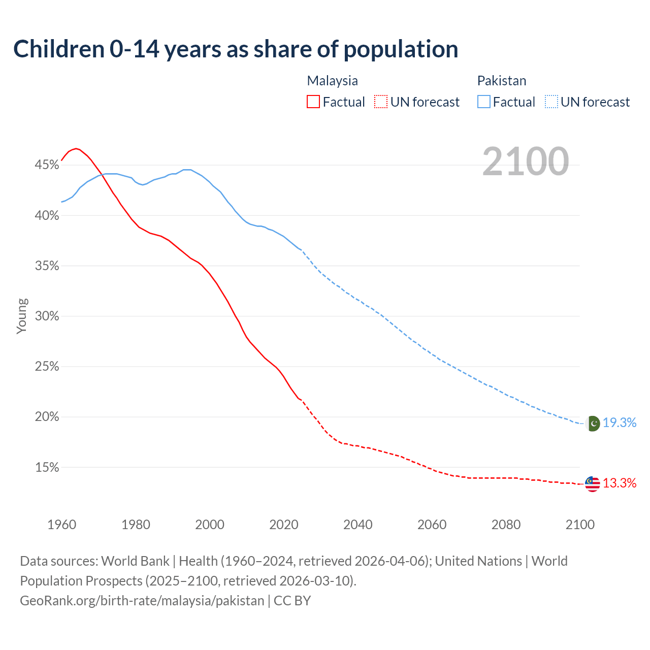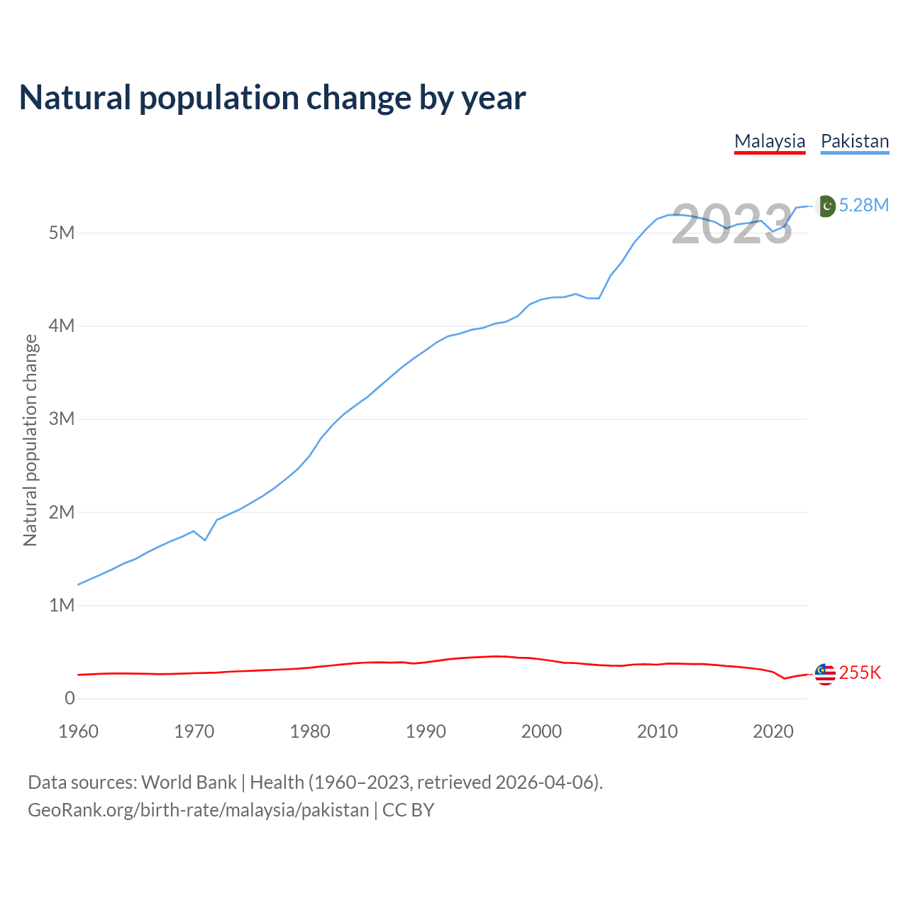 According to the latest available data on birth rates, the fertility rate in Malaysia was 1.55 children per woman in 2023, compared to 3.61 in Pakistan in 2023. The replacement level is considered to be 2.1 children per woman.