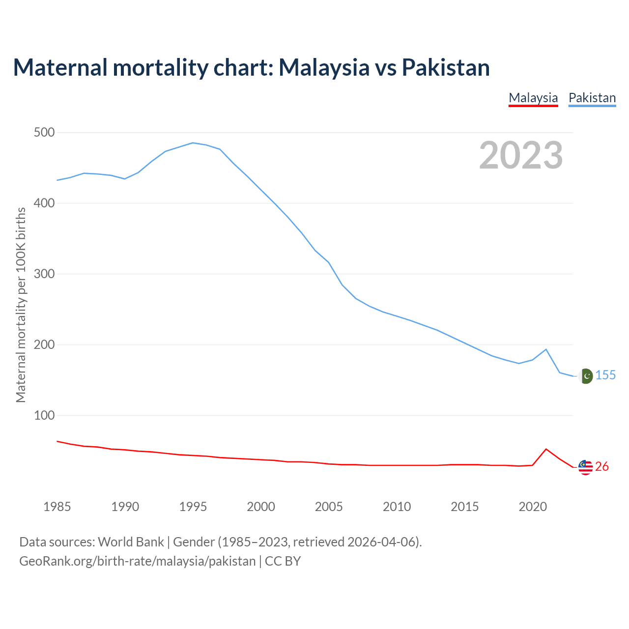 The maternal mortality rate, which is the probability of dying during childbirth or within 42 days of pregnancy termination, is 26 deaths per 100,000 live births in Malaysia, compared to 155 deaths in Pakistan.