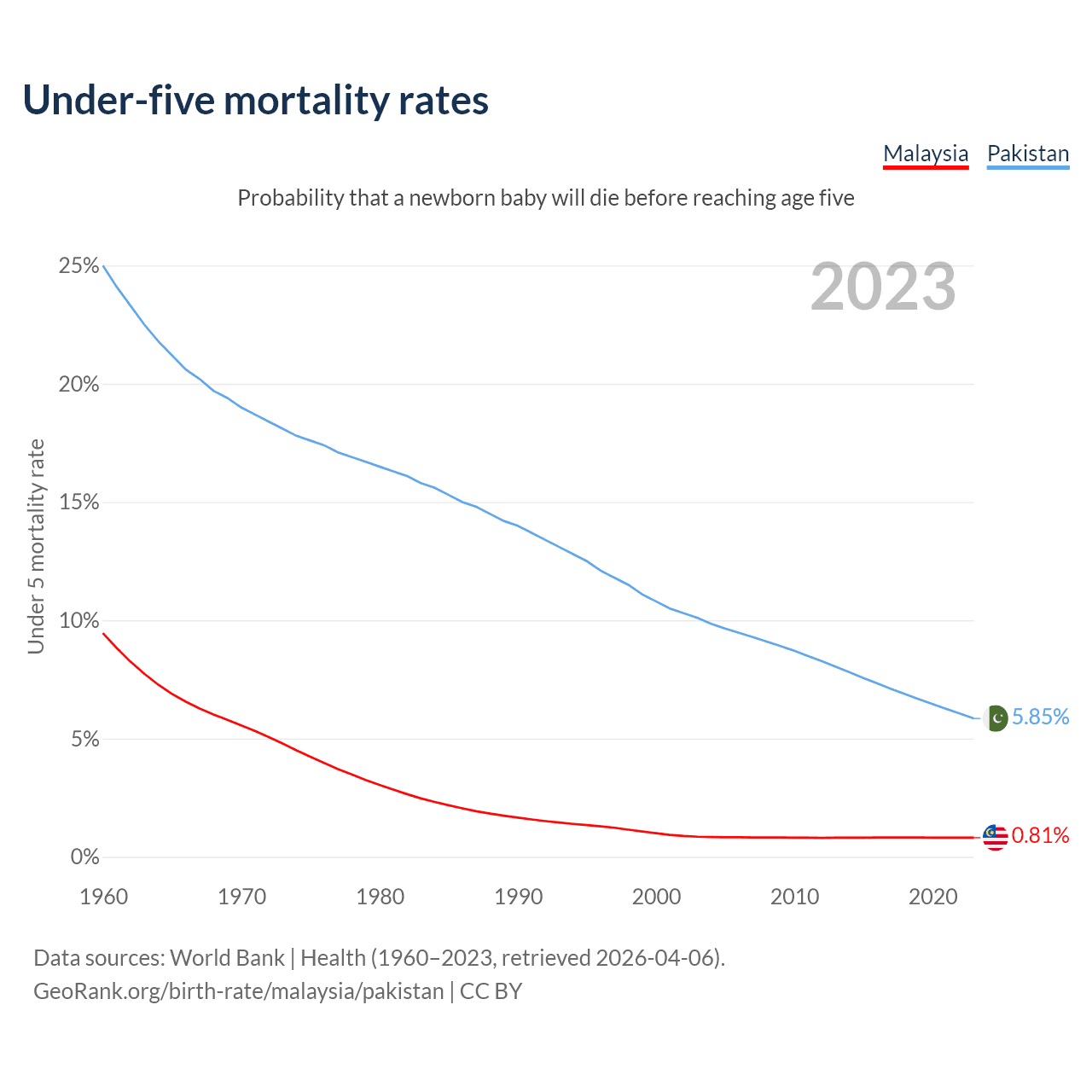 The chance that a newborn baby will die before reaching age five is 0.81% in Malaysia and 5.85% in Pakistan. Above is a chart with historical data on under-five mortality rates.