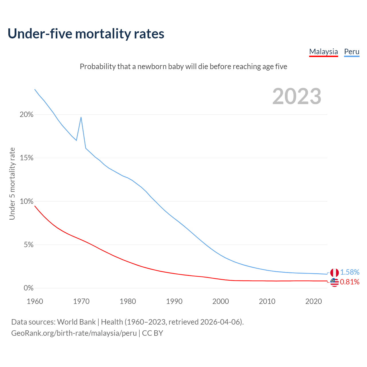 The chance that a newborn baby will die before reaching age five is 0.81% in Malaysia and 1.58% in Peru. Above is a chart with historical data on under-five mortality rates.