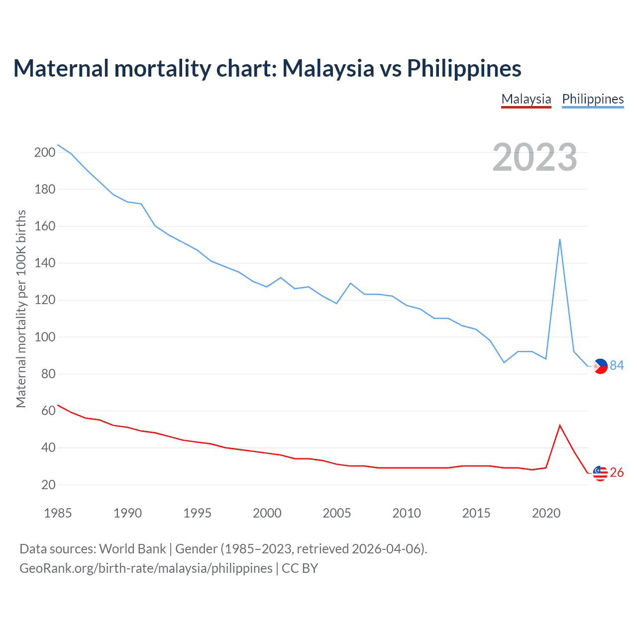 The maternal mortality rate, which is the probability of dying during childbirth or within 42 days of pregnancy termination, is 26 deaths per 100,000 live births in Malaysia, compared to 84 deaths in the Philippines.