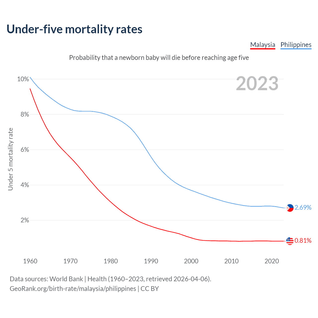 The chance that a newborn baby will die before reaching age five is 0.81% in Malaysia and 2.69% in the Philippines. Above is a chart with historical data on under-five mortality rates.