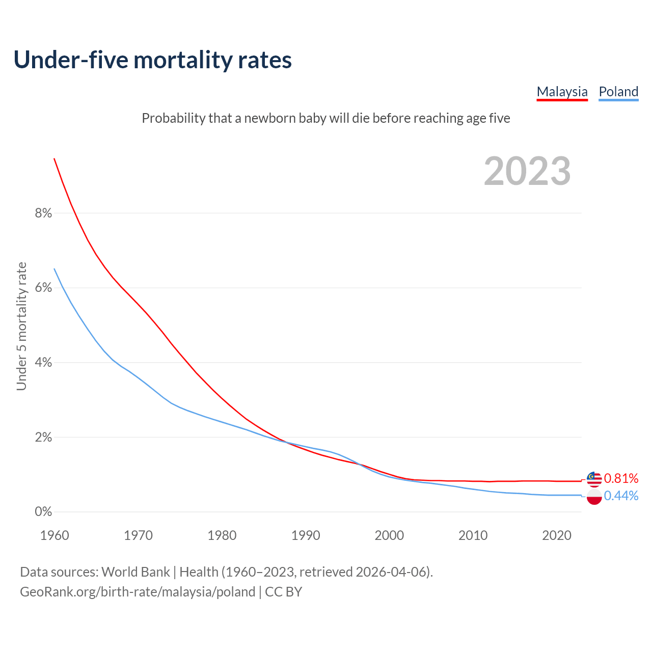 The chance that a newborn baby will die before reaching age five is 0.81% in Malaysia and 0.44% in Poland. Above is a chart with historical data on under-five mortality rates.